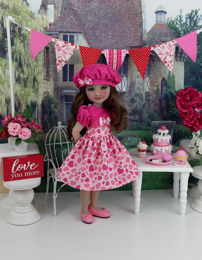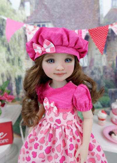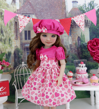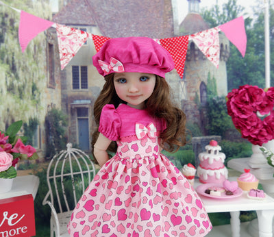 This darling dress is the perfect addition to any Fashion Friend's wardrobe for celebrating Valentine's Day. The dress is made of a cute heart print in fuchsia, coral and pink on baby pink cotton. The bodice is fully lined and features a contrast overlay of variegated fuchsia print cotton trimmed with pink crochet lace across the chest. A plaid coral ribbon bow adorns the bodice. The short sleeves are made of variegated print cotton with a bit of elastic above the elbow. The skirt is full and gathered at the waist for a beautiful silhouette. The dress fastens in back with buttons. Finish the look off with the matching hat. The beret is made of variegated fuchsia print cotton with a coral plaid ribbon bow embellishing the hat brim.
