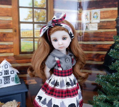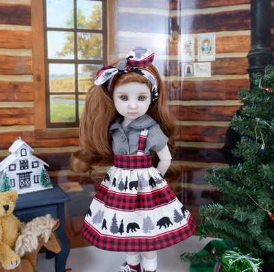 This charming ensemble will be a perfect addition to your Ruby Red Fashion Friend's wardrobe for this winter. The blouse is made of a pretty grey square print cotton. The blouse features cap sleeves and a buster brown collar trimmed with grey piping. The blouse fastens down the front with buttons. The adorable jumper is made of a cute striped bear silhouette among grey trees and strips of burgundy and black buffalo check cotton. The skirt features straps that attach at the waist. The skirt fastens with a button covered snap at the waist band. Add the matching headband for a hair accessory. The retro style knot headband is made of bear and square print cottons and features elastic behind the neck for easy styling.