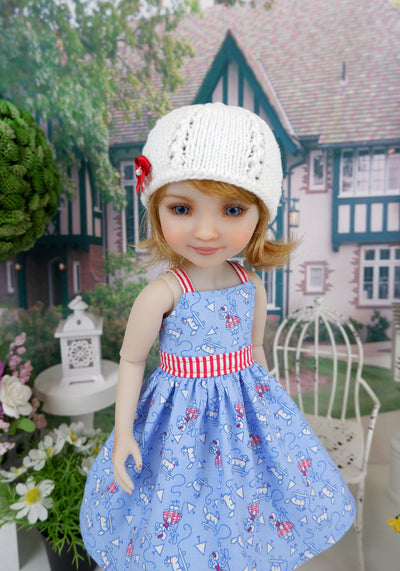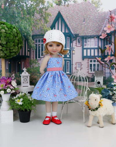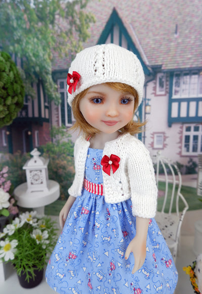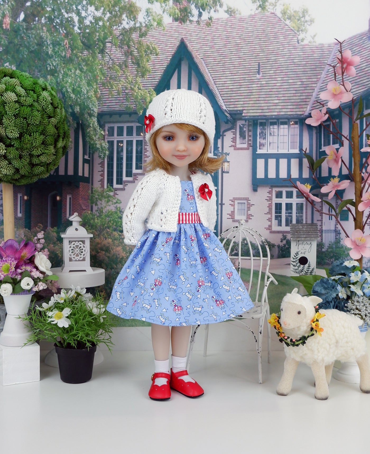 This precious sundress and sweater ensemble is the perfect addition to your Fashion Friend's wardrobe. The dress is made of a darling reproduction style Little Bo Peep print with her sheep in navy, white and red on blue cotton. The bodice has tiny contrast red stripe print cotton straps at the shoulders and is fully lined. The contrast waistband is also made of stripe cotton. The skirt is full and gathered at the waist for a wonderful silhouette. The dress fastens in back with buttons. Wear the dress alone or pair with the coordinating sweater. The sweater is made of high quality white yarn with 3/4 sleeves and a red ribbon bow on one lapel. Complete the look with the matching hat. The hat is also made of white yarn featuring a red ribbon bow on the edge.