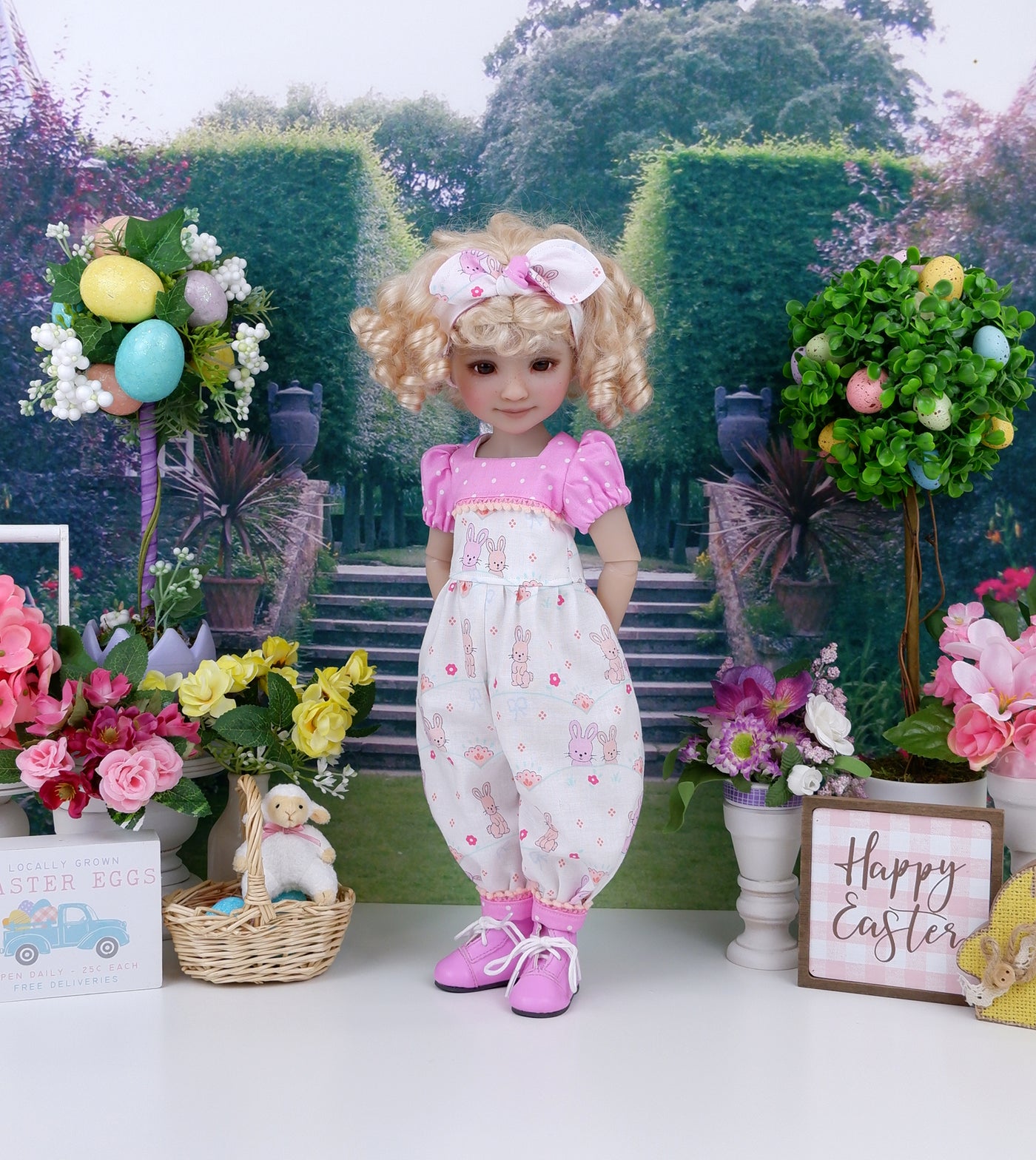 This sweet romper is the perfect addition to any Fashion Friend's wardrobe for Easter. The romper is made of a cute pink and peach bunny print with flowers on white cotton. The bodice is fully lined with a contrast overlay of pink polka dot sporting a square neckline and adorned with peach pom pom trim. The short gathered sleeves are made of polka dot print and have a bit of elastic above the elbow. The full length pants are gathered lightly at the waist and feature pom pom trim at the contrast polka dot leg cuffs. The romper fastens in back with buttons. Add the matching headband for a hair accessory. The retro style knot headband is made of rabbit and polka dot print cottons and features elastic behind the neck for easy styling.