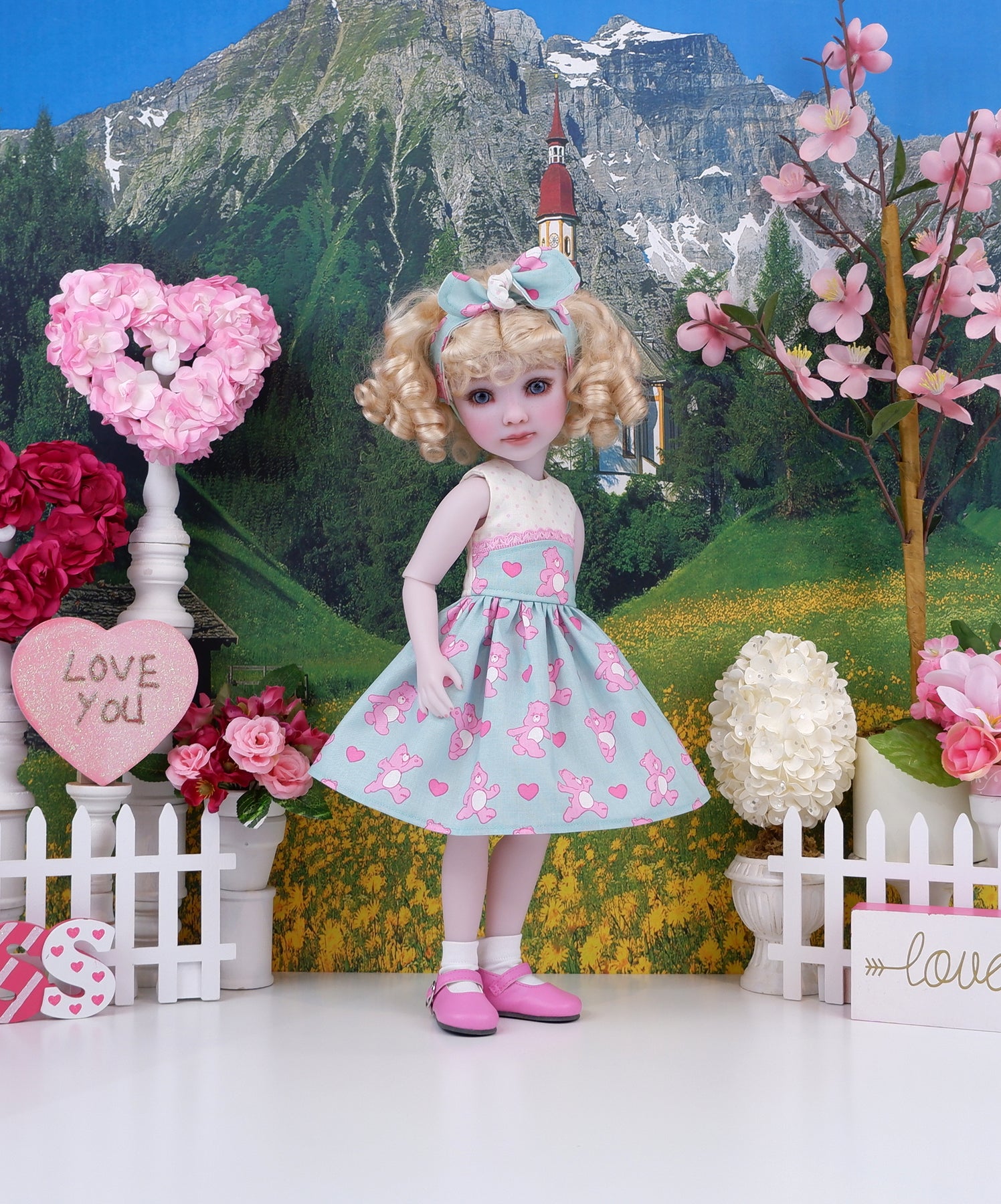 This darling dress is the perfect addition to any Fashion Friend's wardrobe. The dress is made of a cute pink Care Bear print with pink hearts on seafoam cotton. The fully lined sleeveless bodice is made of pink polka dot print cotton with a contrast overlay of Care Bear print at the waist trimmed with pink crochet lace. The skirt is full and gathered at the waist for a wonderful silhouette. The dress fastens in back with buttons. Add the matching headband for a hair accessory. The retro style knot headband is made of Care Bear & polka dot print cottons and features elastic behind the neck for easy styling.
