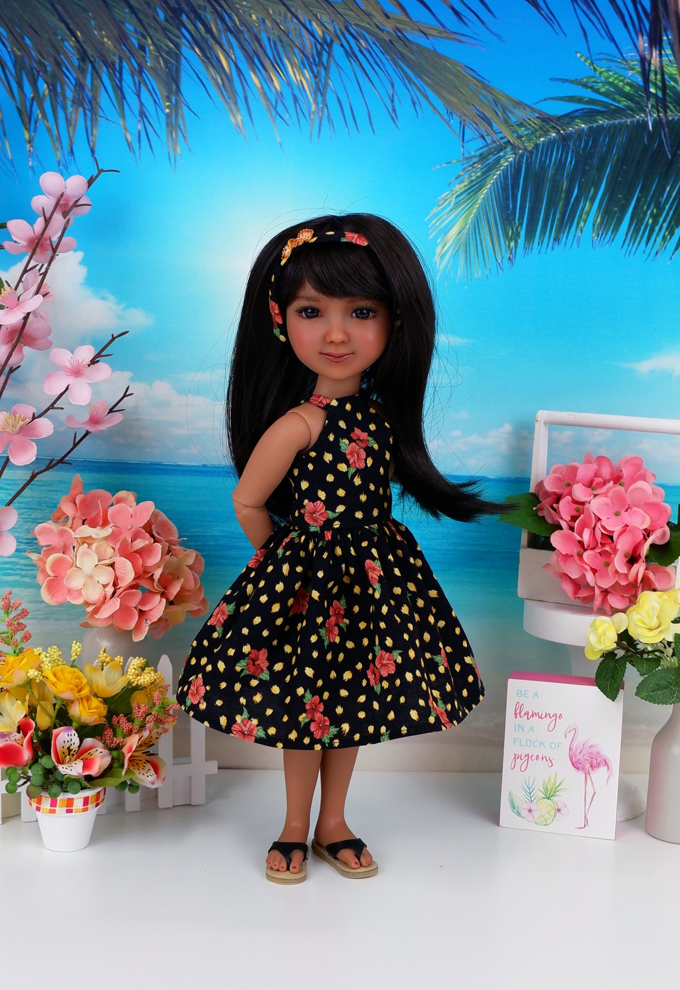 This stunning sundress ensemble is a great addition to any Ruby Red Fashion Friend's wardrobe. The dress is made of a gorgeous persimmon hibiscus print with yellow spots on black cotton. The fully lined bodice has a high neck in front with angled straps that attach in back. The skirt is full and gathered at the waist for a wonderful silhouette. The dress fastens in back with buttons with a faux double breasted look. Add the matching headband to finish the look. The wire frame headband is covered with hibiscus print cotton embellished with a two variegated orange and persimmon ribbon flowers.