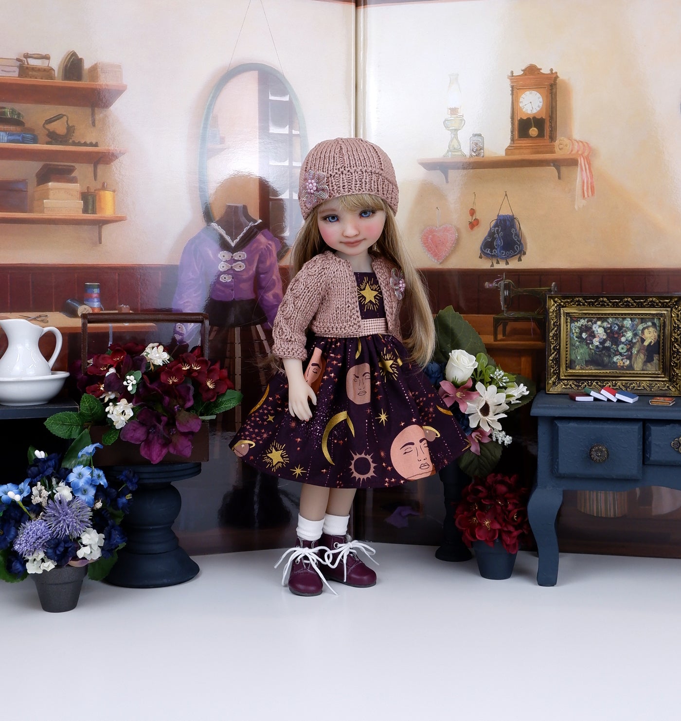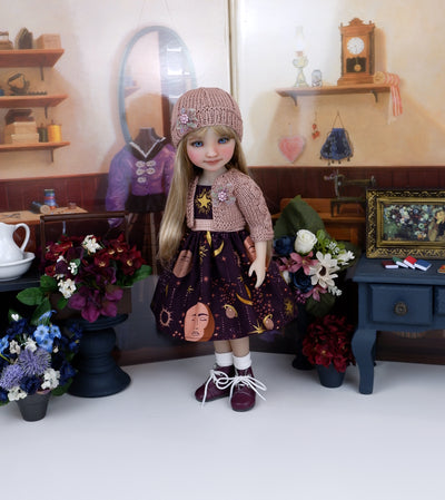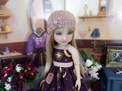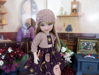 This gorgeous sundress and sweater ensemble is the perfect addition to your Fashion Friend's wardrobe for those Autumn vibes. The dress is made of a beautiful celestial print with stars, comets and the moon in mauve and gold on raisin cotton. The bodice has tiny contrast dusty mauve herringbone print cotton straps at the shoulders and is fully lined. The contrast waistband is also made of herringbone cotton. The skirt is full and gathered at the waist for a wonderful silhouette. The dress fastens in back with buttons. Wear the dress alone or pair with the coordinating sweater. The sweater is made of high quality dusty mauve yarn with 3/4 sleeves and a dusty mauve ribbon flower on one lapel. Complete the look with the matching hat. The hat is also made of dusty mauve yarn featuring an iridescent ribbon flower on the edge.