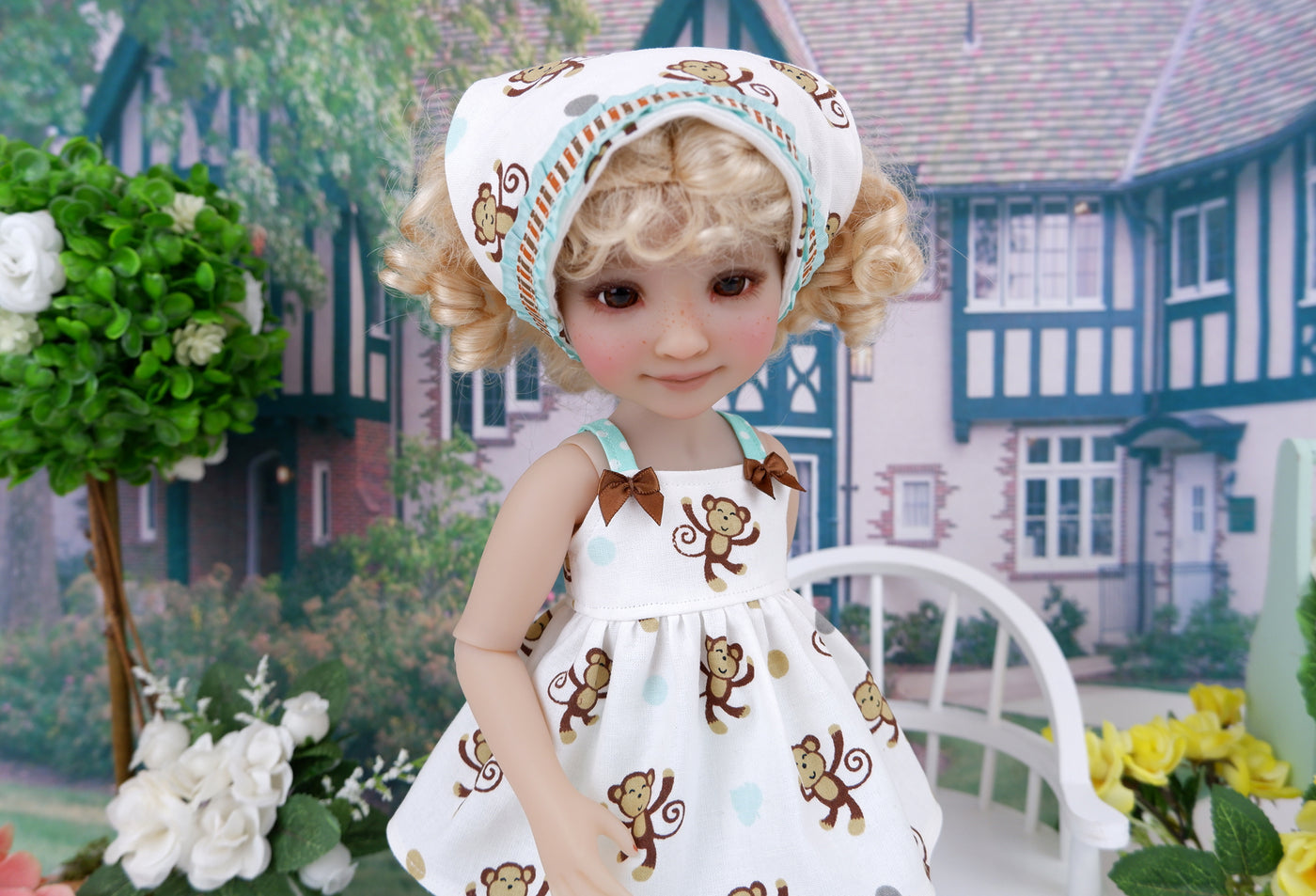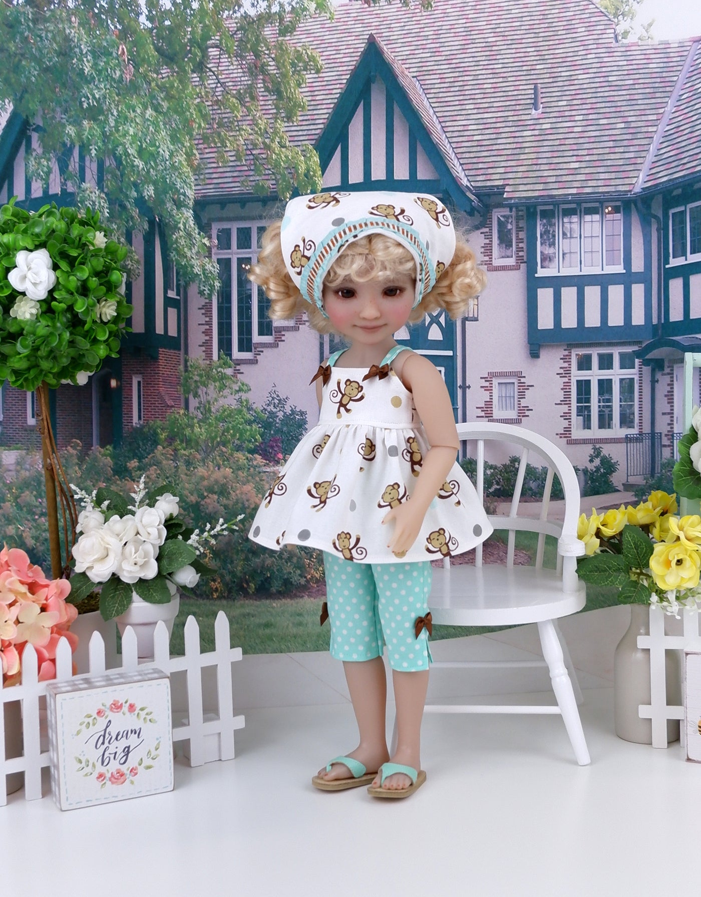 This charming layered ensemble is a great addition to any Ruby Red Fashion Friend's wardrobe. The babydoll top is made of a cute brown monkey print with polka dots and leaves in grey and seafoam on white cotton. The fully lined bodice has tiny contrast straps in seafoam polka dot print cotton at the shoulders and a full peplum skirt. Two tiny brown ribbon bows adorn the bodice at the straps. The top fastens in back with buttons. Beneath her top she wears a pair of coordinating capri pants. The pants are made from seafoam polka dot print cotton with top stitching to create a faux fly and splits at the calf with brown ribbon bows. The capris feature elastic at the waist for easy dressing. Finish the look off with the matching kerchief. The kerchief is made of monkey print cotton, adorned with a row of brown striped ribbon over seafoam ruffled ribbon across the front. The kerchief features elastic in back for an easy on and off style.