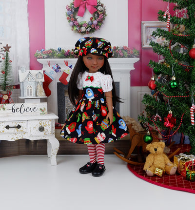 This adorable dress is a great addition to any Fashion Friend's wardrobe for this winter. The dress is made of a charming mitten print with snowmen, holly, reindeer, snow and candy canes in primary colors on black cotton. The fully lined bodice is made of red polka dot print on white cotton with a contrast overlay of mitten print at the waist trimmed with green rick rack. A red ribbon bow with green jingle bell adorns the bodice. The short gathered sleeves are made of polka dot print and have a bit of elastic above the elbow. The skirt is full and gathered at the waist for a wonderful silhouette. The dress fastens in back with buttons. Finish the look off with the matching hat. The fully lined beret is made of glove print cotton with a red ribbon bow and green jingle bell embellishing the hat brim.