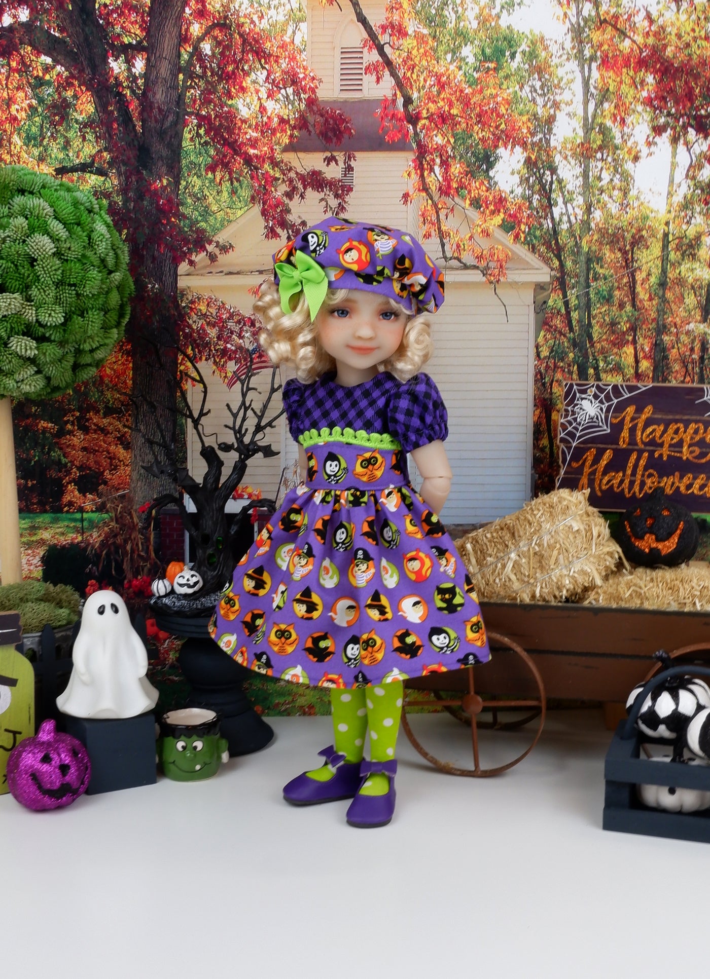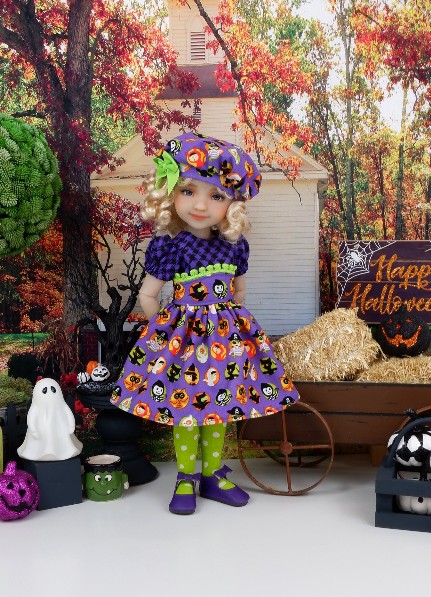 This adorable dress is the perfect addition to any Fashion Friend's wardrobe for Halloween. The dress is made of a charming Halloween costume print with Witches, Ghosts, Black Cats, Owls, Skeletons, Devils and Pirates on purple cotton. The fully lined bodice is made of purple and black check print cotton with a contrast overlay of Halloween print at the waist trimmed with apple green pom pom trim. The short gathered sleeves have a bit of elastic above the elbow. The skirt is full and gathered at the waist for a wonderful silhouette. The dress fastens in back with buttons. Finish the look off with the matching hat. The fully lined beret is made of Halloween print cotton with an apple green ribbon bow embellishing the hat brim.