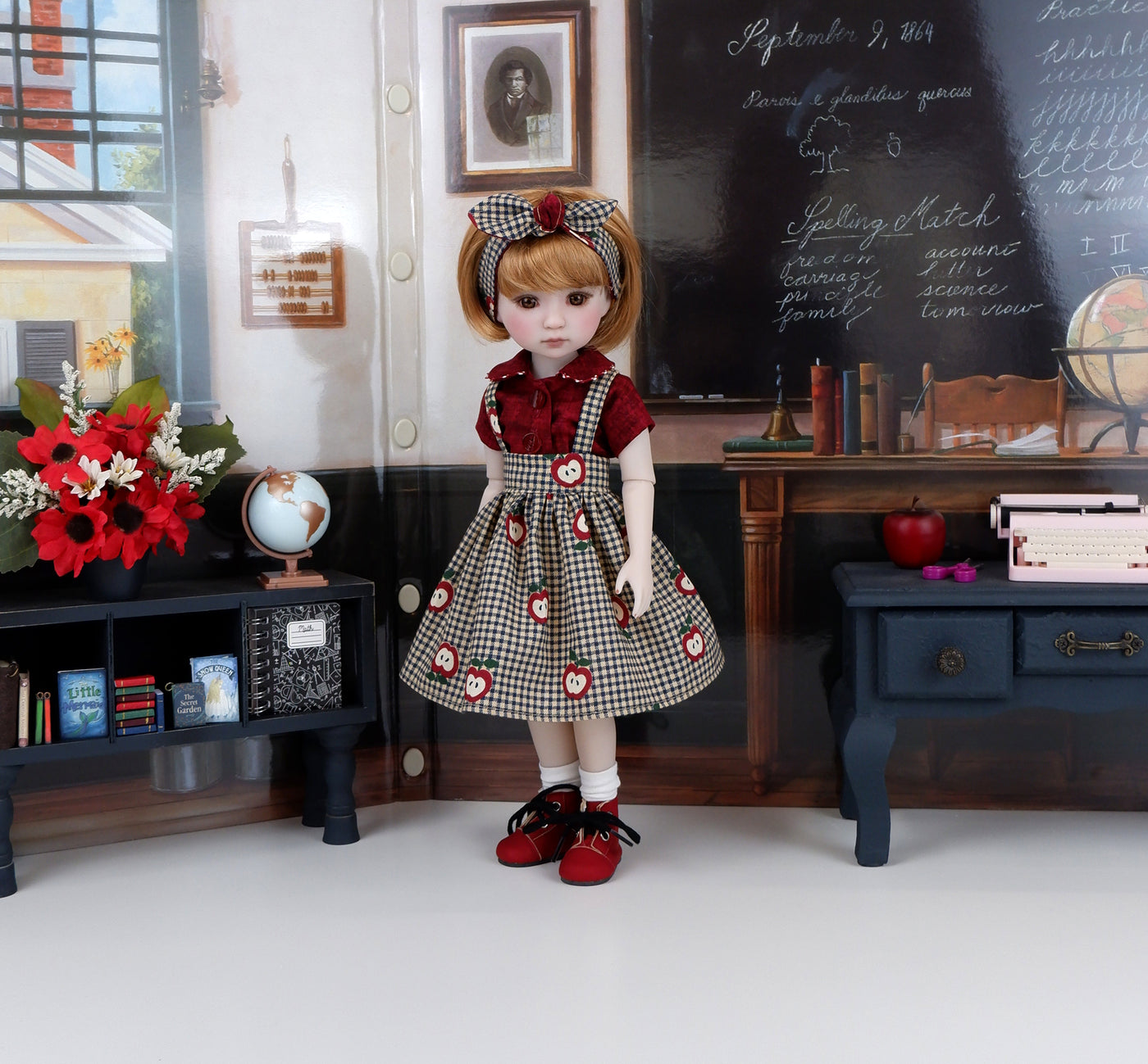 This precious ensemble will be a perfect addition to your Ruby Red Fashion Friend's wardrobe for this school season. The blouse is made of a lovely variegated cranberry print cotton. The blouse features cap sleeves and a buster brown collar trimmed with cranberry and ivory rick rack. The blouse fastens down the front with buttons. The adorable jumper is made of a sweet apple print on navy blue and cream gingham print cotton. The skirt features straps that attach at the waist. The skirt fastens with a button covered snap at the waist band. Add the matching headband for a hair accessory. The retro style knot headband is made of apple and variegated print cottons and features elastic behind the neck for easy styling.