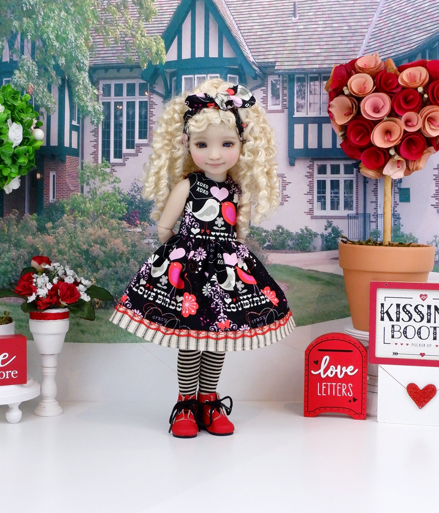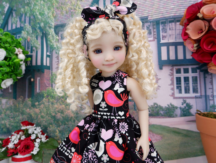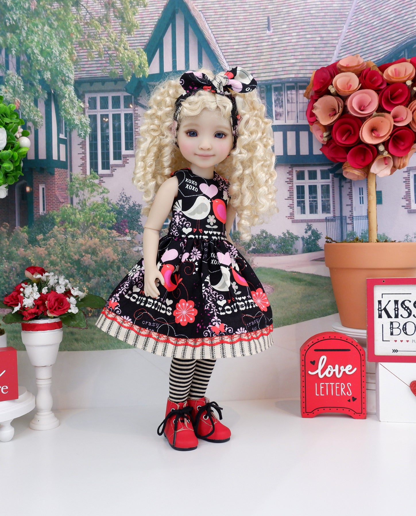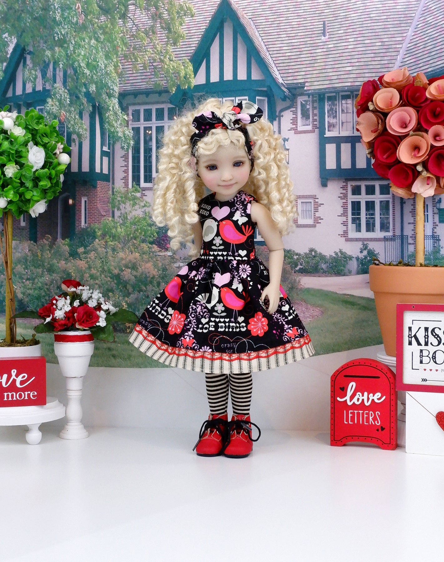 This adorable sleeveless dress is the perfect addition to your Fashion Friend's wardrobe for Valentine's Day. The dress is made of a charming love bird print with a 60s vibe in ivory, red and pink on black cotton. The sleeveless bodice is fully lined. The skirt is gathered at the waist for a pretty silhouette with a contrast band of ivory and black ticking stripe print cotton trimmed with red lace above the hem. The dress fastens in back with buttons. Add the matching headband for a hair accessory. The retro style knot headband is made of heart and stripe print cottons and features elastic behind the neck for easy styling.