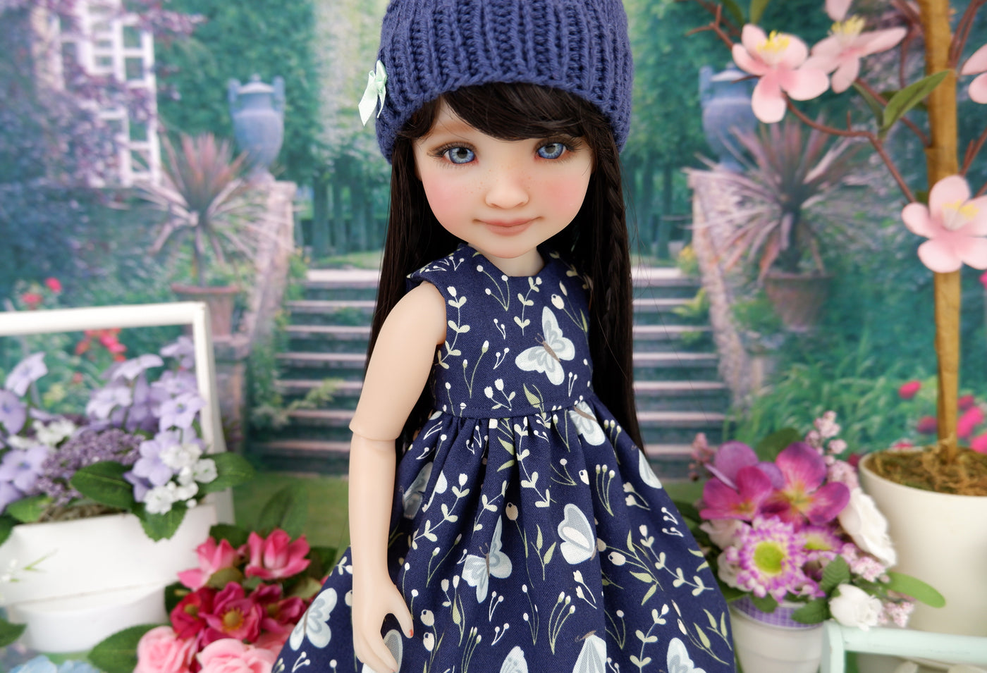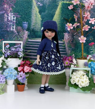 This beautiful dress and sweater ensemble is the perfect addition to your Fashion Friend's wardrobe. The dress is made of a precious floral and butterfly print in dusty aqua and sage on navy blue cotton. The sleeveless bodice is fully lined with a higher waistline. The skirt is gathered at the waist for a pretty silhouette with dusty sage crochet lace peeking out beneath the hem. The dress fastens in back with buttons. Wear the dress alone or pair with the coordinating sweater. The sweater is made of high quality navy yarn with 3/4 sleeves and an aqua ribbon bow on one lapel. Complete the look with the matching hat. The hat is also made of navy yarn featuring an aqua ribbon bow on the edge.