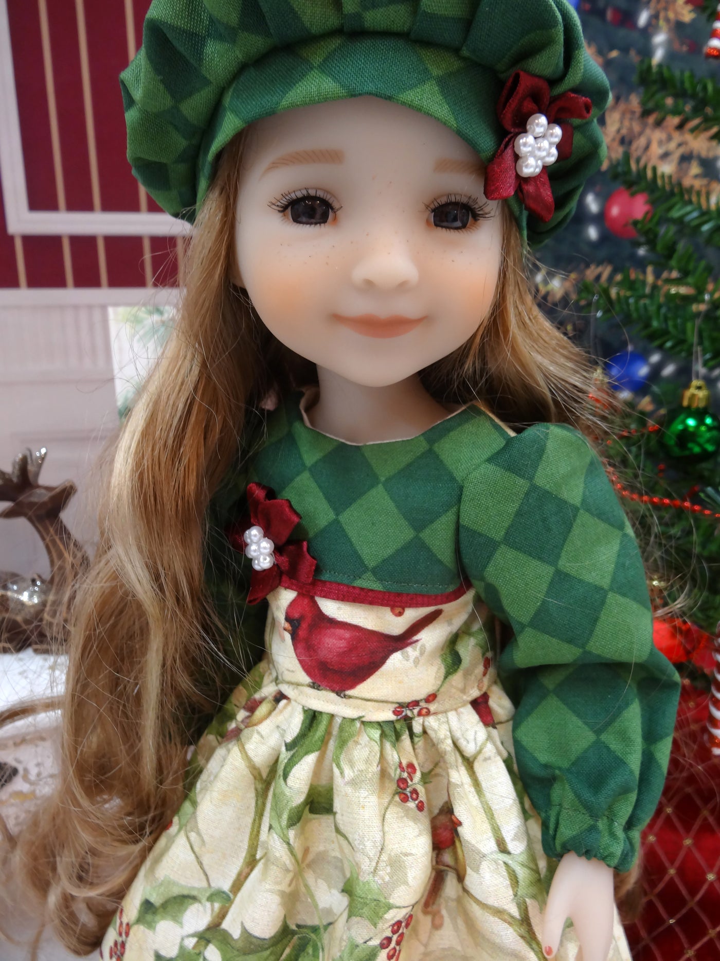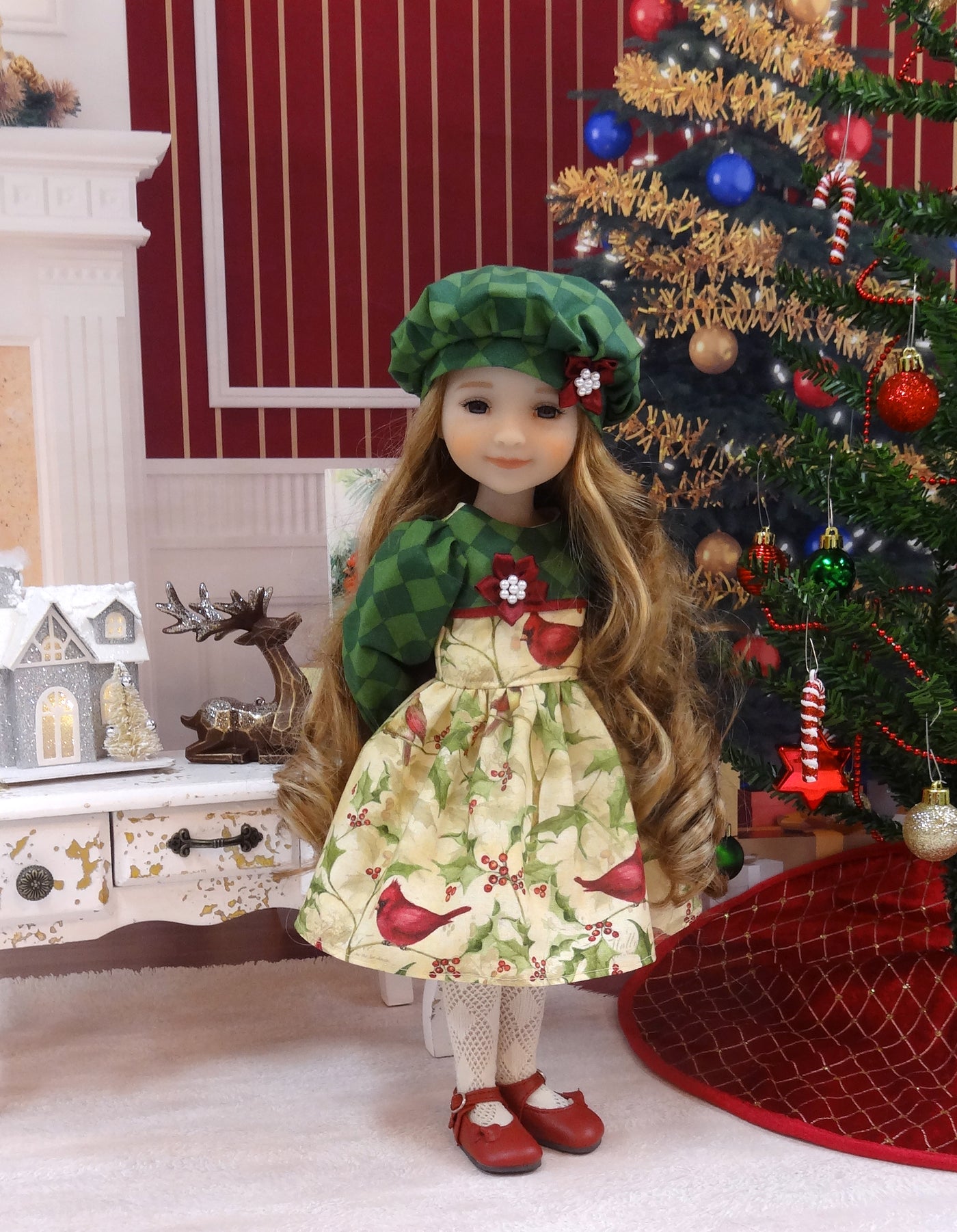 This gorgeous dress is the perfect addition to any Fashion Friend's wardrobe for this holiday season. The dress is made of a lovely burgundy cardinal print with watercolor holly leaves on ivory cotton. The bodice is fully lined and features a contrast overlay of green argyle print cotton in front embellished with burgundy print cotton across the chest. A burgundy ribbon flower adorns the bodice. The long gathered sleeves are also made of argyle cotton and have a bit of elastic at the wrist. The skirt is full and gathered at the waist for a wonderful silhouette. The dress fastens in back with buttons. Finish the look off with the matching hat. The fully lined beret is made of green argyle print cotton with a burgundy ribbon flower embellishing the hat brim.