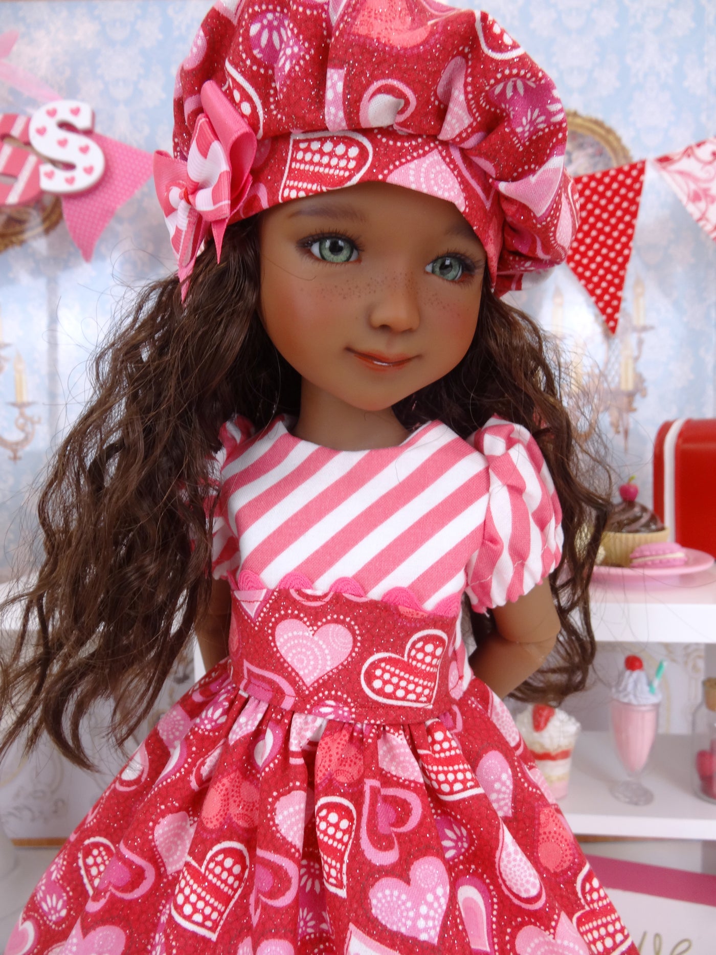 This precious dress is the perfect addition to your Fashion Friend's wardrobe for Valentine's Day. The dress is made of a beautiful heart print in pink and coral on red cotton. The fully lined bodice is made of coral striped print cotton with a contrast overlay of heart print at the waist trimmed with pink rick rack. The short gathered sleeves have a bit of elastic above the elbow. The skirt is full and gathered at the waist for a wonderful silhouette with pink rick rack peeking out beneath the hem. The dress fastens in back with buttons. Finish the look off with the matching hat. The fully lined beret is made of heart print cotton with a layered pink and coral plaid ribbon bow embellishing the hat brim.