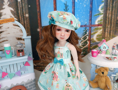 This darling sundress ensemble is a great addition to any Ruby Red Fashion Friend's wardrobe for this Christmas season. The dress is made of a delicious gingerbread house print in peach and coral with candy canes and gingerbread men on aqua cotton. The bodice has contrast aqua stripe cotton straps at the shoulders and is fully lined. The contrast waistband is also made of stripe cotton. A teal ribbon bow adorns the waist. The skirt is full and gathered at the waist for a wonderful silhouette with an inset of aqua crochet lace above the contrast stripe band at the hem. The dress fastens in back with buttons. Finish the look off with the matching hat. The fully lined beret is made of gingerbread cotton with a teal ribbon bow embellishing the hat band.