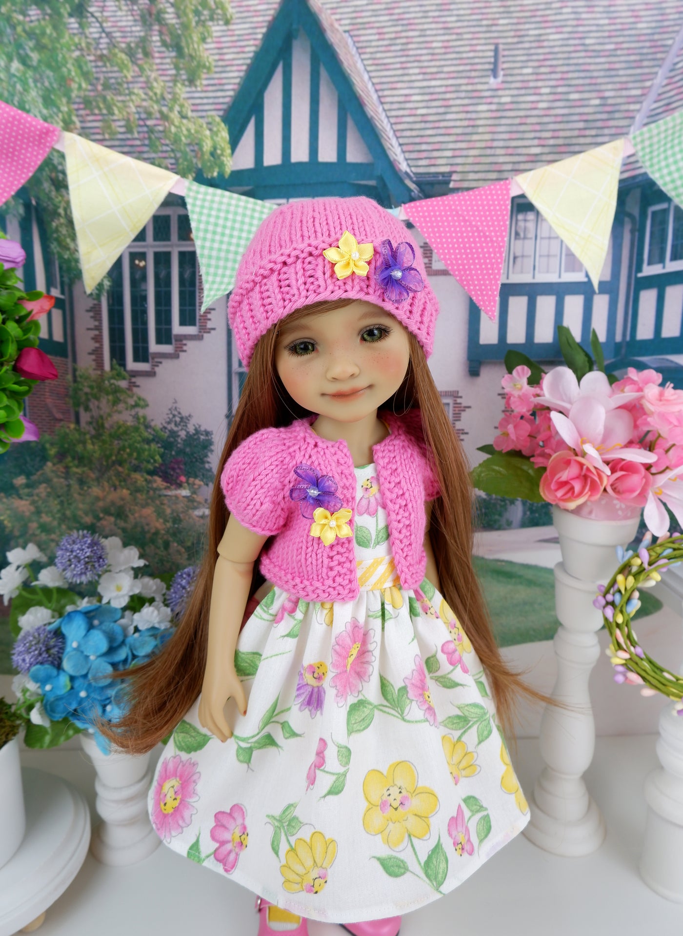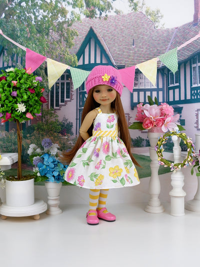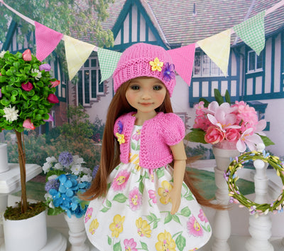 This darling dress and sweater ensemble is the perfect addition to your Fashion Friend's wardrobe. The dress is made of a charming Daisy Kingdom print with smiling faces in yellow, pink and purple on white cotton. The bodice has tiny contrast yellow stripe print cotton straps at the shoulders and is fully lined. The contrast waistband is also made of stripe print cotton. The skirt is full and gathered at the waist for a wonderful silhouette. The dress fastens in back with buttons. Wear the dress alone or pair with the coordinating sweater. The sweater is made of high quality bubblegum pink yarn with short sleeves and adorned with purple and yellow ribbon flowers on one lapel. Complete the look with the matching hat. The hat is also made of bubblegum pink yarn also featuring purple and yellow ribbon flowers on the edge.