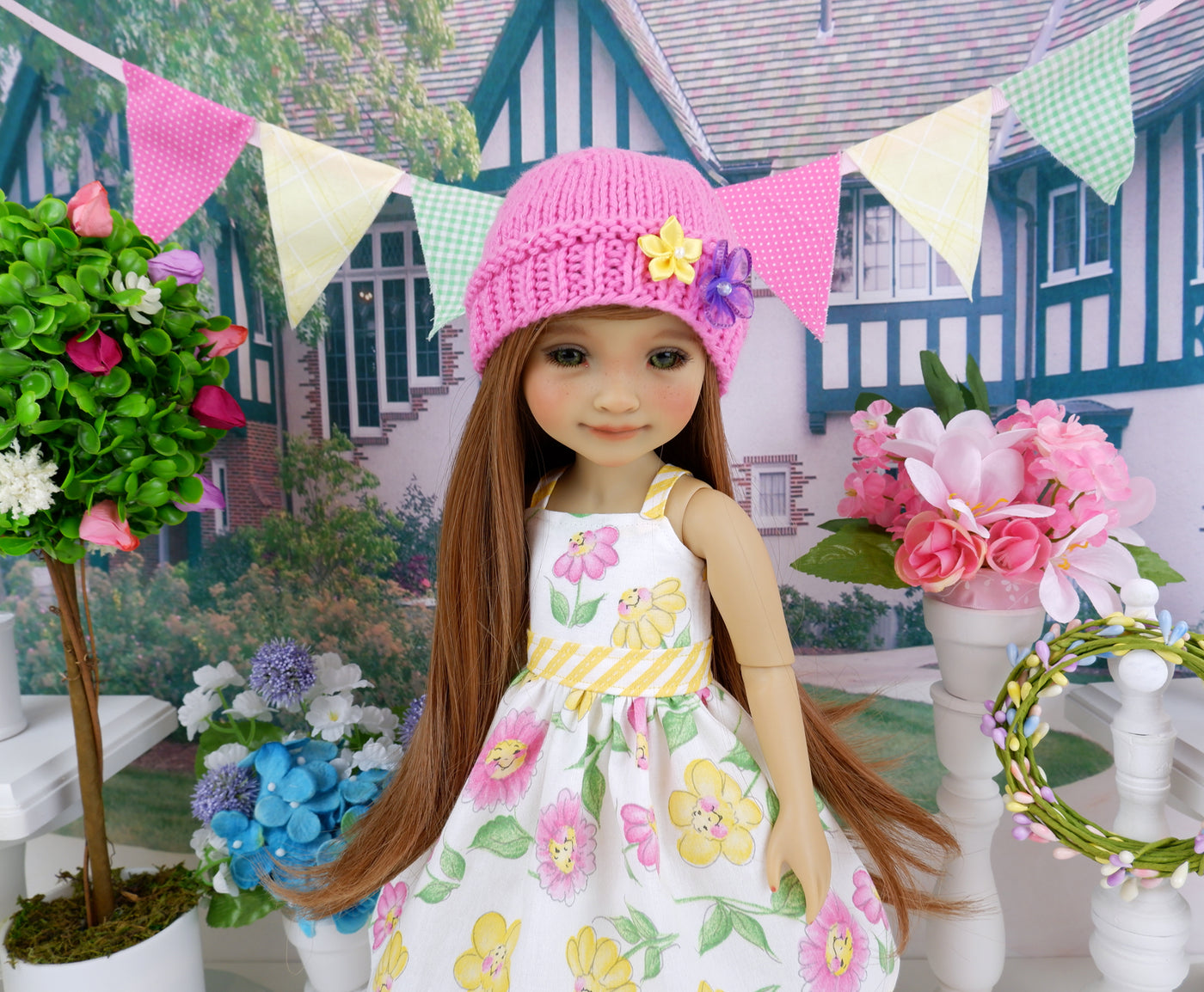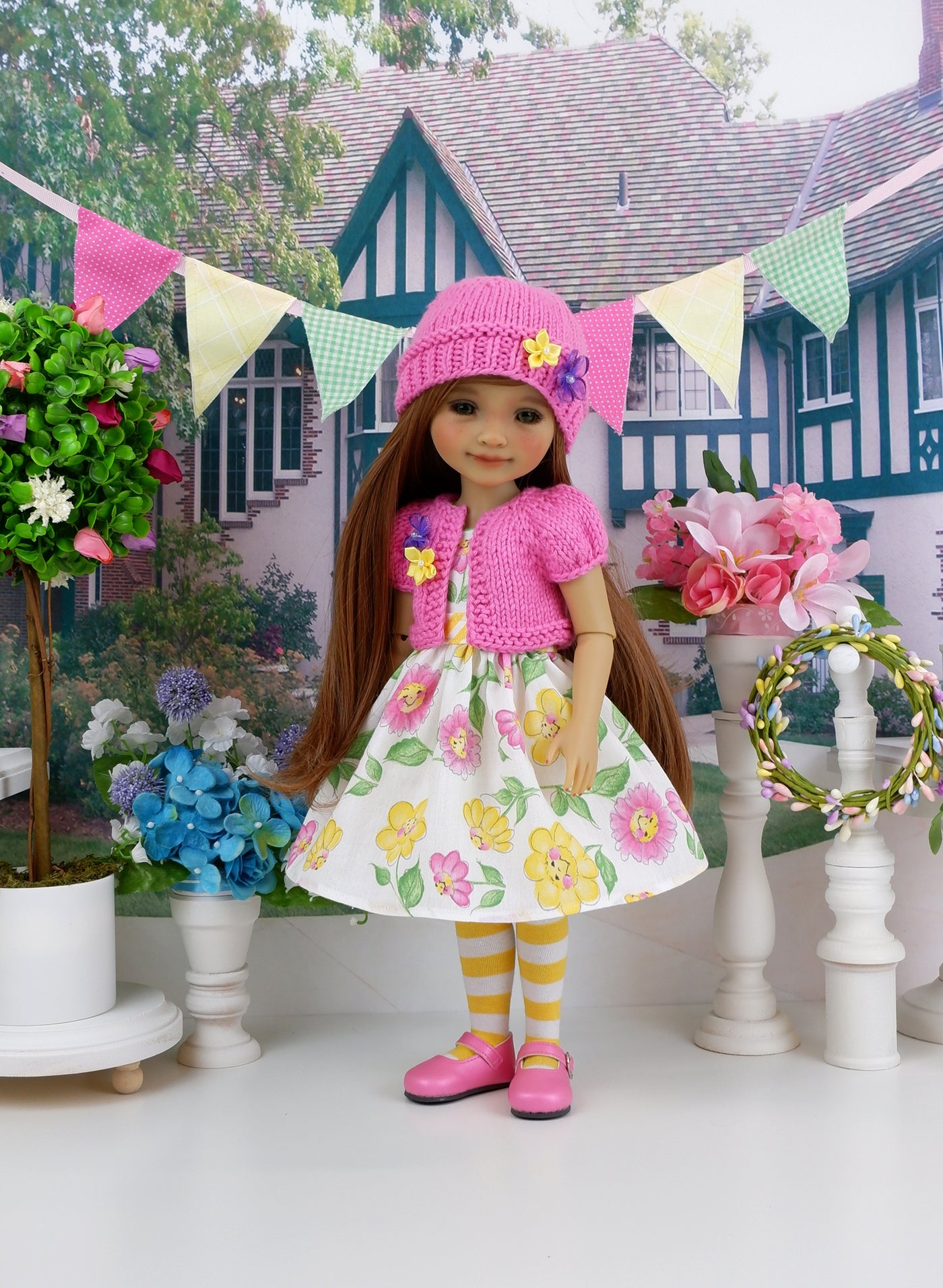 Pearl bubblegum pink mary jane dress shoes with yellow and white striped tights are included to complete the ensemble. The tights are made by Wendy at Doll Secrets. The sweater and hat are made by KNIT n PLAY.