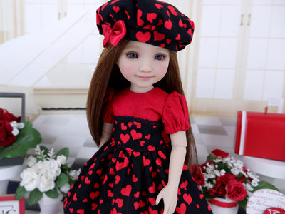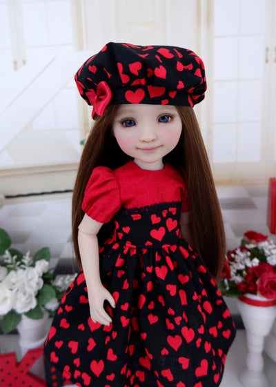 This stunning dress is a great addition to any Fashion Friend's wardrobe for Valentine's Day. The dress is made of a beautiful red heart print on black cotton. The fully lined bodice is made of red square print cotton with a contrast overlay of heart print at the waist trimmed with delicate black crochet lace. The short gathered sleeves are made of square print and have a bit of elastic above the elbow. The skirt is full and gathered at the waist for a wonderful silhouette. The dress fastens in back with buttons. Finish the look off with the matching hat. The fully lined beret is made of heart print cotton with a red ribbon bow embellishing the hat brim.