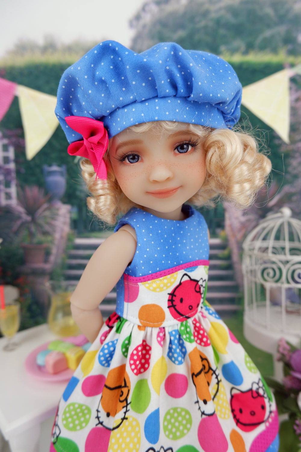 This adorable dress is a great addition to any Fashion Friend's wardrobe. The dress is made of a Hello Kitty print with polka dots in red, yellow, fuchsia, green, blue and orange on white cotton. The fully lined sleeveless bodice is made of blue polka dot print cotton with a contrast overlay of Hello Kitty print at the waist trimmed with fuchsia polka dot print cotton contrast bias trim. The skirt is full and gathered at the waist for a wonderful silhouette with an inset of fuchsia polka dot cotton above the contrast blue polka dot print cotton band at the hem. The dress fastens in back with buttons. Finish the look off with the matching hat. The fully lined beret is made of blue polka dot print cotton with a pink ribbon bow embellishing the hat band.