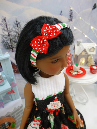 This sweet sleeveless dress is the perfect addition to your Fashion Friend's wardrobe for this holiday season. The dress is made of a delicious holiday print with Santa, snowman, gingerbread and snowflake cupcakes on black cotton. The fully lined sleeveless bodice is made of white stripe cotton with a contrast overlay of cupcake print at the waist trimmed with red, green and white striped cotton. The skirt is gathered at the waist for a pretty silhouette. The dress fastens in back with buttons. Add the matching headband to finish the look. The wire frame headband is covered with red, green and white stripe cotton embellished with a red polka dot ribbon bow.