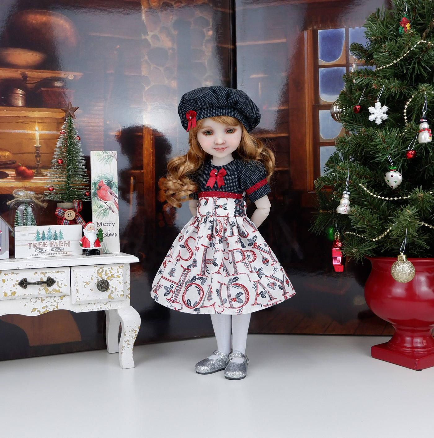 This lovely dress is a great addition to any Fashion Friend's wardrobe for celebrating this holiday season. The dress is made of a beautiful Christmas words print with Peace, Joy, Holiday, Noel in black, crimson and silver on white cotton. The bodice is fully lined and features a contrast overlay of black dot print cotton in front embellished with crimson crochet lace across the chest. A crimson ribbon bow adorns the bodice. The short sleeves are made of dot print cotton gathered to a sleeve band trimmed with crimson crochet lace above the elbow. The skirt is full and gathered at the waist for a wonderful silhouette. The dress fastens in back with buttons. Finish the look off with the matching hat. The fully lined beret is made of black dot print cotton with a crimson ribbon bow embellishing the hat brim.