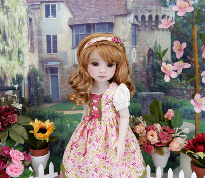 This lovely dress is the perfect Bavarian style addition to any Fashion Friend's wardrobe. The dress is made of a beautiful rose print on pale pink cotton. The fully lined bodice features ivory leaf print cotton beneath floral print overlays trimmed with loden green crochet lace. Rose pink rayon ribbon is laced through the crochet lace to create a dirndl appearance. The short sleeves are made of ivory leaf print cotton and have a bit of elastic above the elbow. The skirt is full and gathered at the waist with loden green crochet lace over delicate embroidered rose pink lace peeking out beneath the hemline. The dress fastens in back with buttons. Add the matching headband to finish the look. The wire frame headband is covered with rose print cotton embellished with two rose pink ribbon roses.