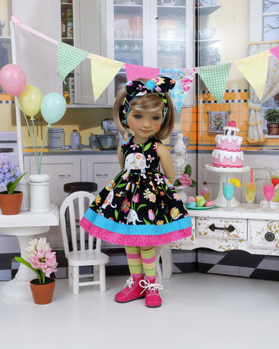 This darling dress is the perfect addition to any Fashion Friend's wardrobe. The dress is made of an adorable elephant print in a garden in bright colors on black cotton. The sleeveless babydoll bodice is fully lined. The skirt is gathered at the babydoll waist for a lovely silhouette with pinked edge tiers in elephant, turquoise polka dot, and fuchsia leaf print cottons. The dress fastens in back with buttons. Add the matching headband for a hair accessory. The retro style knot headband is made of elephant and polka dot print cottons and features elastic behind the neck for easy styling.
