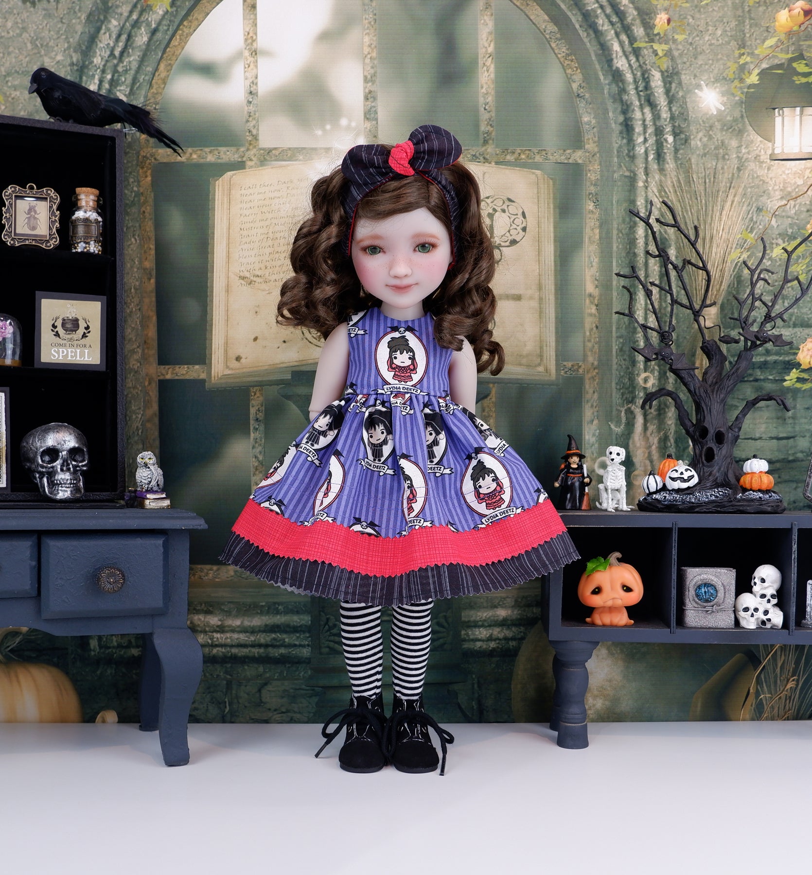 This adorable dress is the perfect addition to your Fashion Friend's wardrobe for this Halloween. The dress is made of a charming Kawaii Lydia Deetz from Beetlejuice print on purple stripe cotton. The sleeveless babydoll bodice is fully lined. The skirt is gathered at the babydoll waist for a lovely silhouette with pinked edge tiers in Beetlejuice, red crosshatch and black stripe print cottons. The dress fastens in back with buttons. Add the matching headband for a hair accessory. The retro style knot headband is made of red crosshatch & black stripe print cottons and features elastic behind the neck for easy styling.