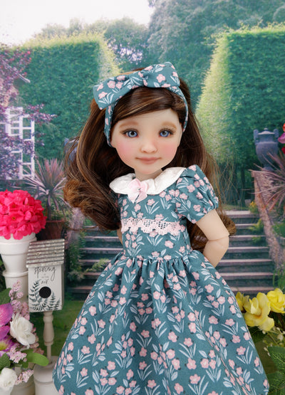 This beautiful ensemble is the perfect addition to any Fashion Friend's wardrobe. The dress is made of a lovely pink floral print on jade cotton. The bodice is fully lined and features an overlay trimmed with pink crochet lace across the chest. A white floral print cotton peter pan collar adds to the charm. A pink ribbon bow is anchored at the collar. The short gathered sleeves feature elastic above the elbow. The skirt is full and gathered at the waist for a wonderful silhouette. The dress fastens in back with buttons. Add the matching headband to finish the look. The headband is made of floral print with a fabric bow and elastic behind the neck.