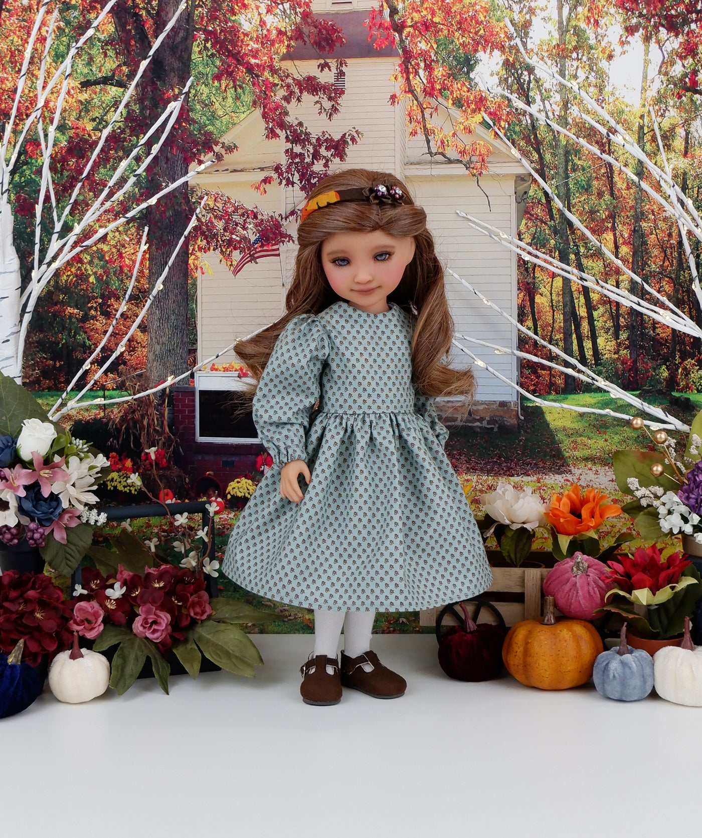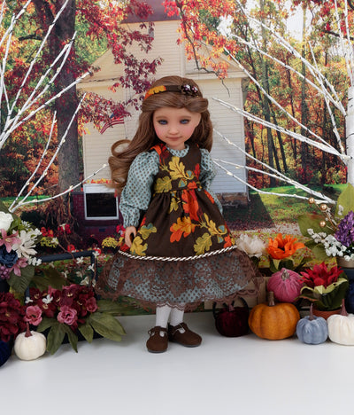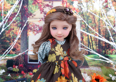 This beautiful dress and pinafore ensemble is the perfect addition to your Ruby Red Fashion Friend's wardrobe for colder months. The dress is made of a pretty dainty floral print in brown on dusty aqua print cotton. The fully lined bodice features long sleeves with a bit of elastic at the wrist. The skirt is gathered at the waist for a wonderful silhouette. The dress fastens in back with buttons. Over her dress she wears a lovely pinafore. The pinafore is made of a stunning oak leaf print with acorns in loden, marigold, orange and dusty aqua on deep brown cotton. The pinafore has a fully lined bodice with a scoop neckline. The pinafore skirt features braided ivory and gold trim over brown lace peeking out beneath the hem. The pinafore fastens in back with buttons. Add the matching headband to finish the look. The wire frame headband is covered with oak print cotton embellished with two brown ribbon flowers.