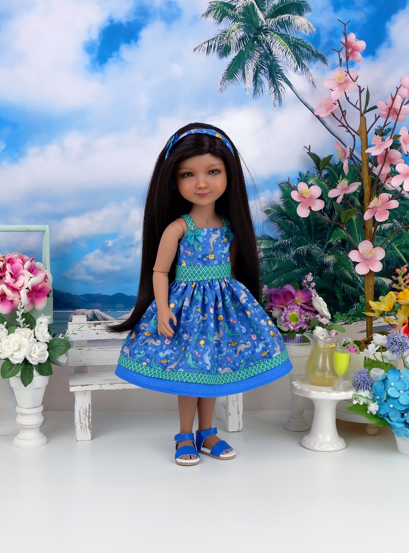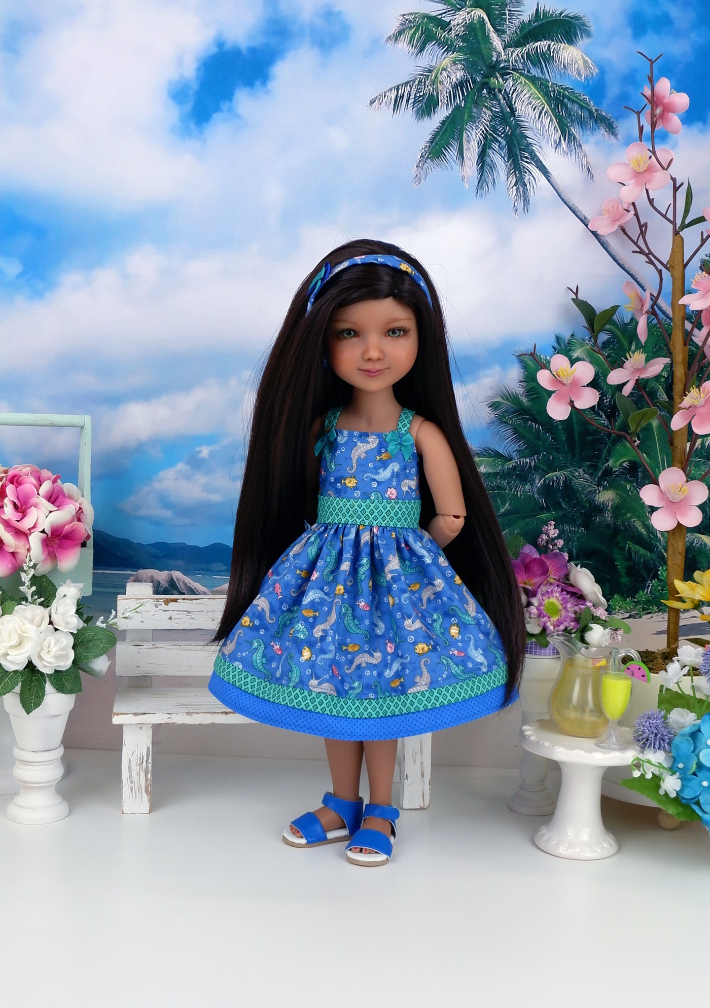 This darling sundress ensemble is a great addition to any Ruby Red Fashion Friend's wardrobe. The dress is made of a cute seahorse and fish print on marine blue cotton. The bodice has tiny contrast jade green diamond print straps at the shoulders and is fully lined. Two dainty jade ribbon bows adorn the straps. The contrast waistband is also made of jade diamond print cotton. The skirt is full and gathered at the waist for a wonderful silhouette with an inset of jade green diamond print cotton above the contrast blue polka dot print band at the hem. The dress fastens in back with buttons. Add the matching headband to finish the look. The wire frame headband is covered with seahorse print cotton embellished with a layered jade and blue ribbon bow.
