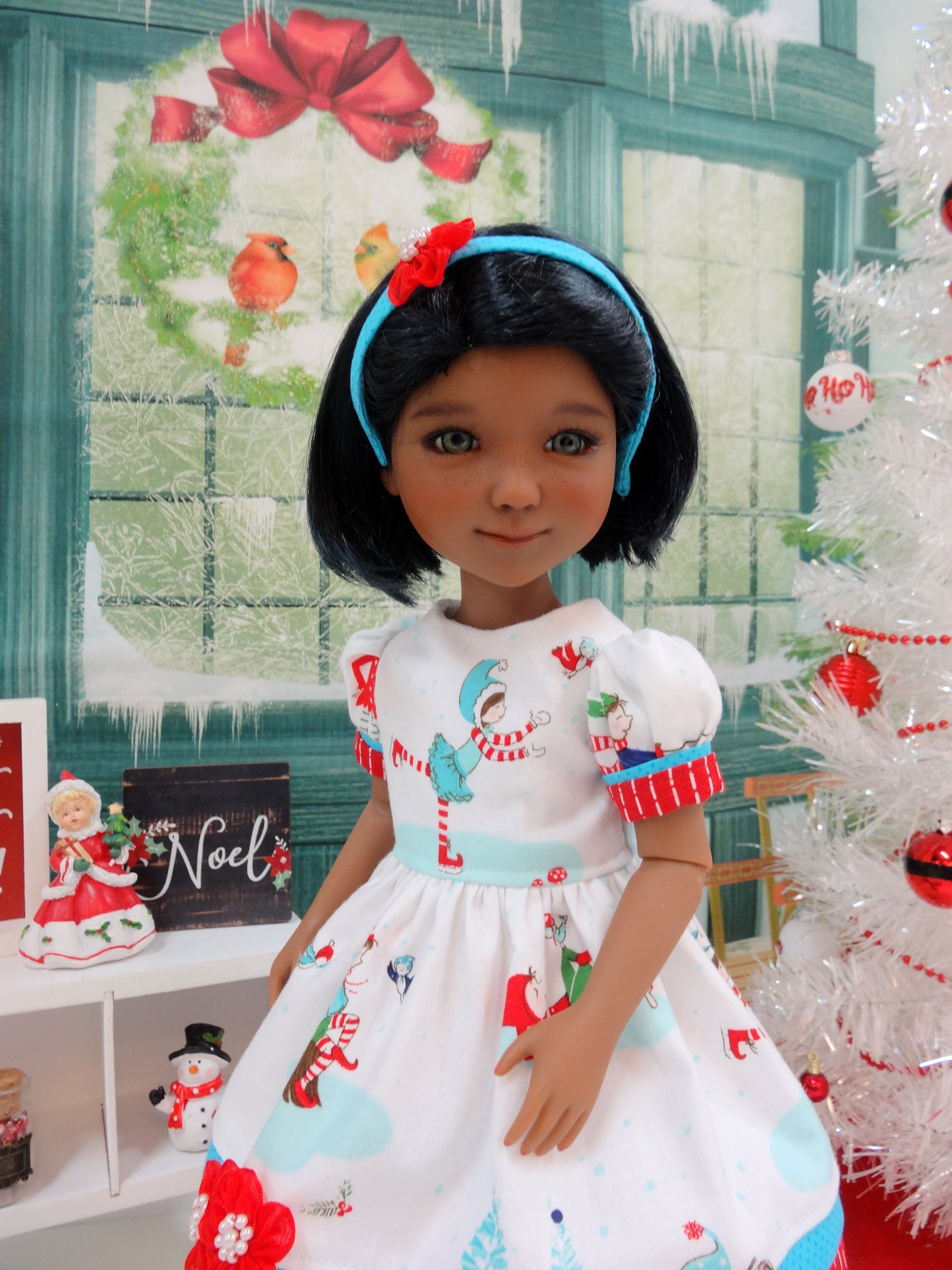 This darling dress is the perfect addition to any Fashion Friend's wardrobe for this winter. The dress is made of a precious pixie print in various winter scenes on white cotton. The short sleeves are gathered to contrast red stripe sleeve bands trimmed with turquoise polka dot contrast cotton above the elbow. The skirt is full and gathered at the waist for the proper silhouette with turquoise polka dot cotton above the contrast red stripe print cotton hem. The dress fastens in back with buttons. Add the matching headband to finish the look. The wire frame headband is covered with turquoise polka dot cotton embellished with a red ribbon flower.