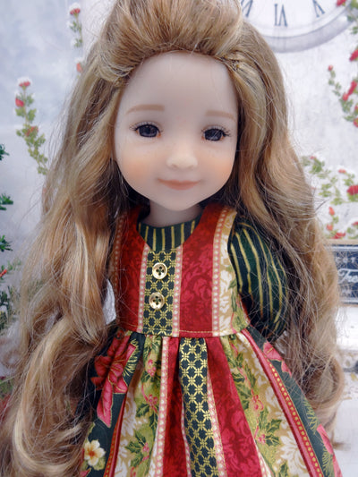 This gorgeous dress and pinafore ensemble is the perfect addition to your Ruby Red Fashion Friend's wardrobe for this Winter. The dress is made of a pretty forest green and gold striped cotton. The fully lined bodice features long sleeves with a bit of elastic at the cuff. The skirt is gathered at the waist for the perfect silhouette. The dress fastens in back with buttons. Over her dress she wears a stunning pinafore. The pinafore is made of an elegant poinsettia striped print in deep magenta, forest green and ivory with accented with gold in cotton. The pinafore has a fully lined bodice with a scoop neckline. Two gold buttons adorn the bodice. The pinafore skirt features gold Venetian lace just below the hem. The pinafore fastens in back with buttons.