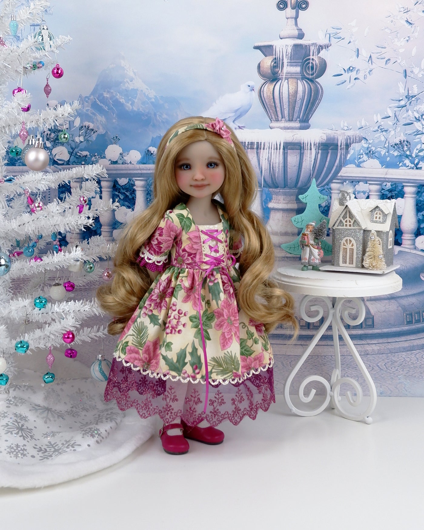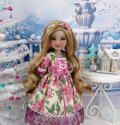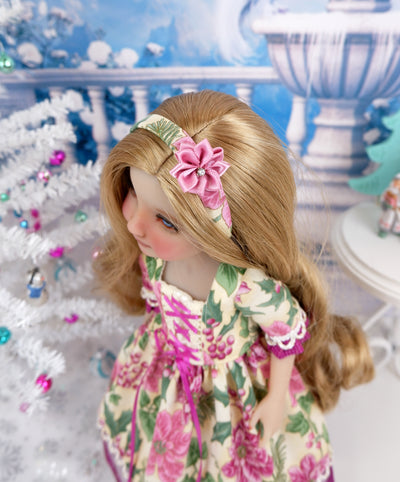 This stunning dress is the perfect Bavarian style addition to any Fashion Friend's wardrobe for celebrating the Christmas holiday season. The dress is made of a beautiful poinsettia print in mulberry and rose on ivory cotton. The fully lined bodice features ivory holly leaf print cotton beneath poinsettia print overlays trimmed with ivory crochet lace. Mulberry ribbon is laced through the crochet lace to create a dirndl appearance. The 3/4 length sleeves are also made of poinsettia cotton with contrast mulberry dot cotton ruffles at the cuff trimmed with decorative gold and ivory looped trim. The skirt is full and gathered at the waist with gold and ivory trim over mulberry embroidered lace peeking out beneath the hemline. The dress fastens in back with buttons. Add the matching headband to finish the look. The wire frame headband is covered with poinsettia print cotton embellished with a rose ribbon flower.