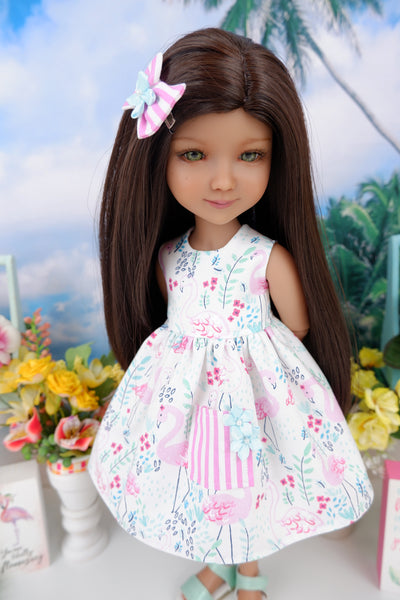 This darling babydoll dress ensemble is a great addition to any Ruby Red Fashion Friend's wardrobe. The dress is made of a precious flamingo print in shades of pink with leaves in aqua, seafoam and turquoise on white cotton. The sleeveless bodice is fully lined with a babydoll waistline. The skirt is gathered at the waist for a pretty silhouette with a contrast pink stripe print cotton pocket adorned with two aqua ribbon flowers. The dress fastens in back with a button covered snap. Add the matching hair clip for an easy hairstyle. A pink stripe print cotton fabric bow features an aqua ribbon flower.
