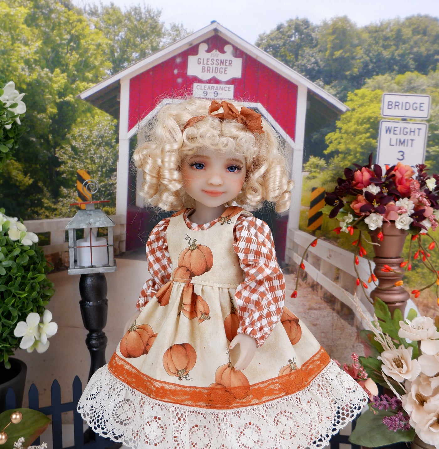 This pretty dress and pinafore ensemble is the perfect addition to your Ruby Red Fashion Friend's wardrobe for this fall. The dress is made of a charming nutmeg gingham print cotton. The fully lined bodice features long sleeves with a bit of elastic at the wrist. The skirt is gathered at the waist for the perfect silhouette. The dress fastens in back with buttons. Over her dress she wears a beautiful pinafore. The pinafore is made of a lovely pumpkin print on cream cotton. The pinafore has a fully lined bodice with a scoop neckline. The pinafore skirt features pumpkin lace above the hem and gathered ivory lace peeking out beneath. The pinafore fastens in back with buttons. Tie the nutmeg crinkle ribbon in her hair for a sweet and simple hair style.