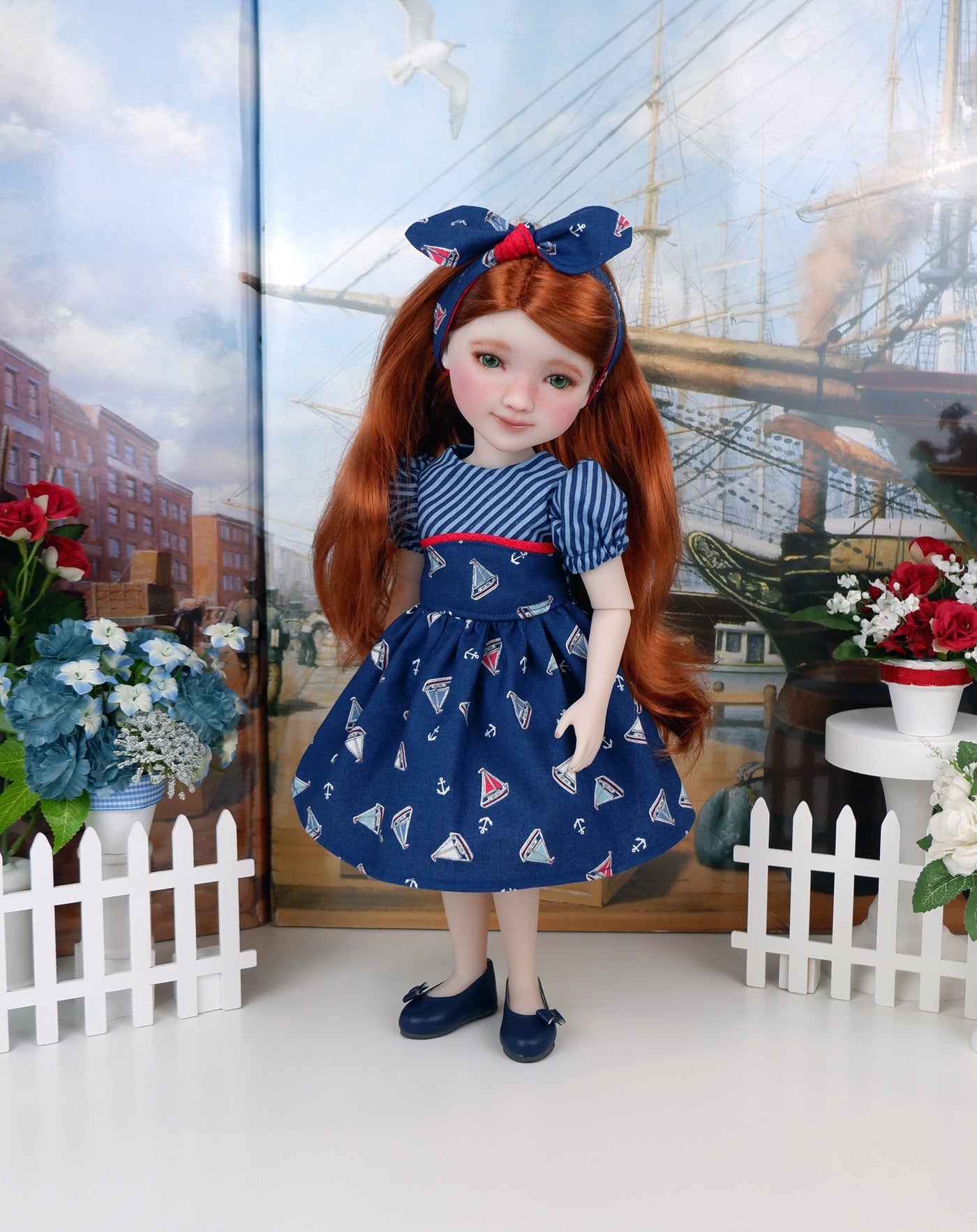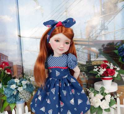 This adorable dress is a great addition to any Fashion Friend's wardrobe for the sailing enthusiast. The dress is made of a darling sailboat print in sky blue, white and crimson on navy blue cotton. The fully lined bodice is made of navy pinstripe print cotton with a contrast overlay of sail print at the waist trimmed with red square print cotton. The short gathered sleeves are made of stripe print and have a bit of elastic above the elbow. The skirt is full and gathered at the waist for a wonderful silhouette. The dress fastens in back with buttons. Add the matching headband for a hair accessory. The retro style knot headband is made of sailboat and red square print cottons and features elastic behind the neck for easy styling.
