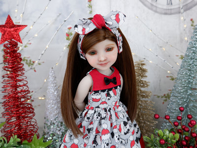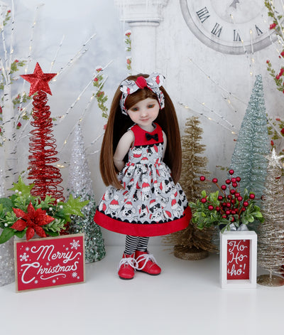 This adorable sleeveless dress is the perfect addition to your Fashion Friend's wardrobe for this Christmas season. The dress is made of a charming puppy print in Santa hats on grey cotton. The bodice is fully lined and features a contrast overlay of red square print cotton trimmed with black rick rack. A black ribbon bow adorns the bodice. The skirt is gathered at the waist for a lovely silhouette with a contrast band of red square cotton trimmed with black rick rack above the hem. The dress fastens in back with buttons. Add the matching headband for a hair accessory. The retro style knot headband is made of dog and square print cottons and features elastic behind the neck for easy styling.