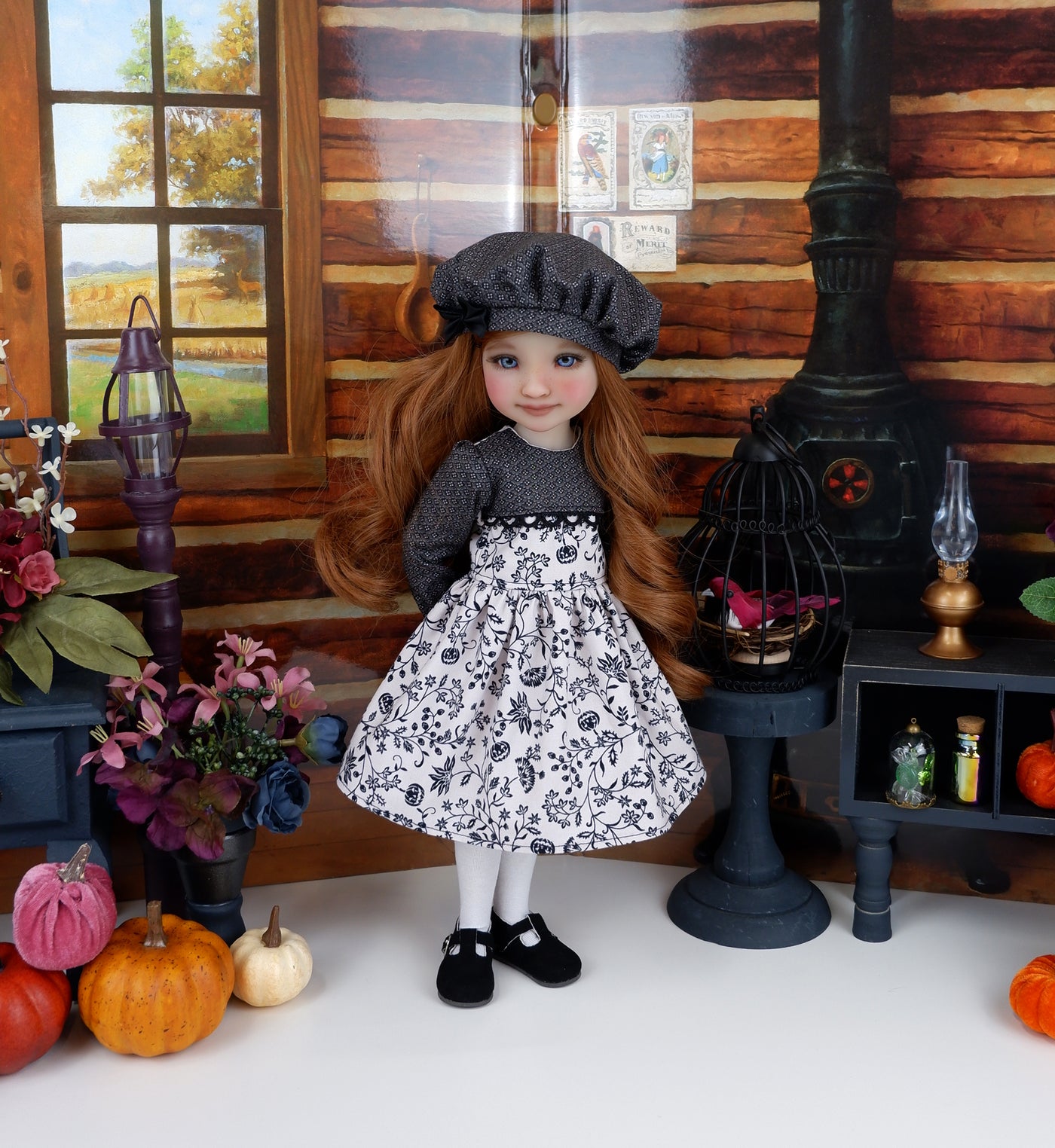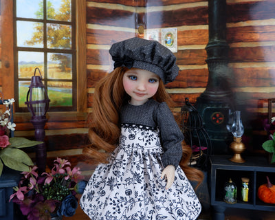 This charming dress is the perfect addition to any Fashion Friend's wardrobe for Halloween. The dress is made of a subtle Halloween print with a lovely black vine print that contains skulls and jack o'lantern pumpkins on dove grey cotton. The bodice is fully lined and features a contrast overlay of black medallion print cotton in front embellished with black crochet lace across the chest. The long gathered sleeves have a bit of elastic at the wrist. The skirt is full and gathered at the waist for a wonderful silhouette. The dress fastens in back with buttons. Finish the look off with the matching hat. The fully lined beret is made of black medallion print cotton with a black ribbon bow embellishing the hat brim.
