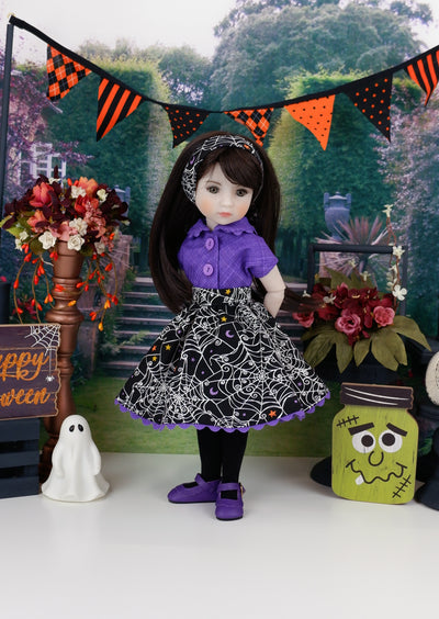 In true retro style this ensemble is a great addition to any Ruby Red Fashion Friend's wardrobe for Halloween. The blouse is made of purple gird print cotton. The blouse features a peter pan collar accented with purple rick rack trim and cap sleeves. The blouse fastens down the front with buttons. The circle skirt creates a pretty silhouette. The skirt is made of an adorable swirly spiderweb print in white with stars and moons in purple, yellow and orange on black cotton. The skirt is cut on the bias with purple rick rack peeking out beneath the hem. The skirt fastens with a button covered snap at the waist band. Finish the look off with the matching headband. The headband is made of spiderweb print and ties behind the neck.