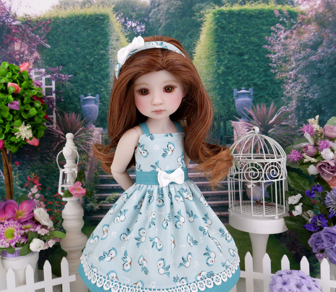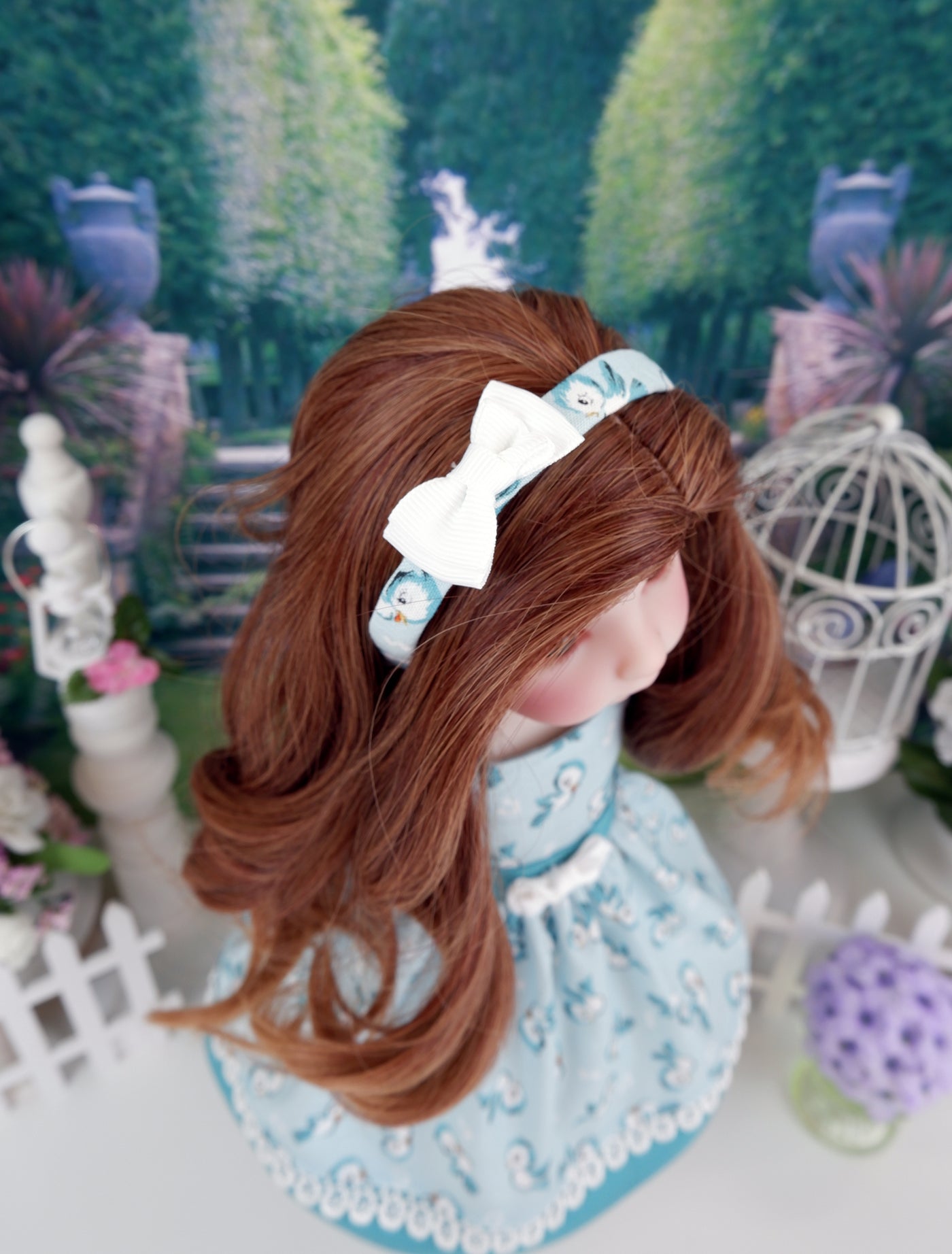 This darling sundress ensemble is a great addition to any Ruby Red Fashion Friend's wardrobe. The sundress is made of a cute bluebird print in teal on muted aqua cotton. The bodice has tiny contrast muted teal pin dot print straps at the shoulders and is fully lined. The contrast waistband is also made of pin dot print cotton. A white ribbon bow adorns the waist. The skirt is full and gathered at the waist for a wonderful silhouette with an inset of delicate white lace above the contrast muted teal pin dot cotton band at the hem. The dress fastens in back with buttons. Add the matching headband to finish the look. The wire frame headband is covered with bluebird print cotton embellished with a white ribbon bow.