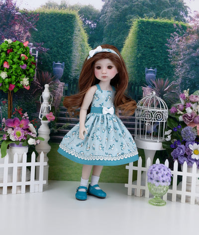 Teal mary jane dress shoes and white socks are included to complete the look. The socks are made by Wendy at Doll Secrets.
