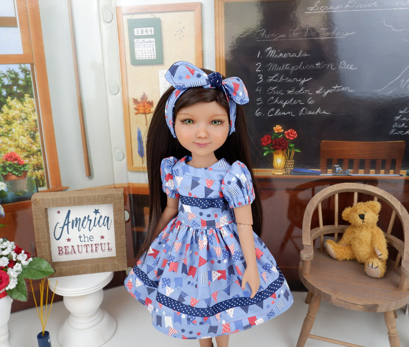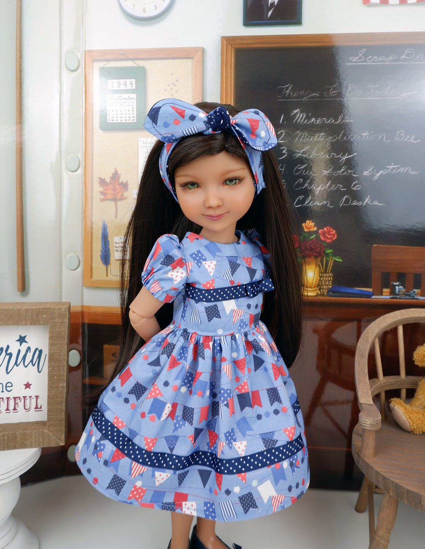 This darling dress is the perfect addition to your Fashion Friend's wardrobe for this Independence Day. The dress is made of a charming bunting print in red, white blue and navy on light blue cotton. The bodice is fully lined with a row of star print navy blue ribbon across the front. A tiny bow, made of star print ribbon adorns the bodice. The short sleeves are gathered with a bit of elastic above the elbow. The skirt is full for the proper silhouette and gathered at the waist with a row of star print ribbon above the hemline. The dress fastens in back with buttons. Add the matching headband for a hair accessory. The retro style knot headband is made of bunting and navy blue star print cottons and features elastic behind the neck for easy styling.