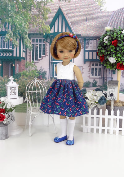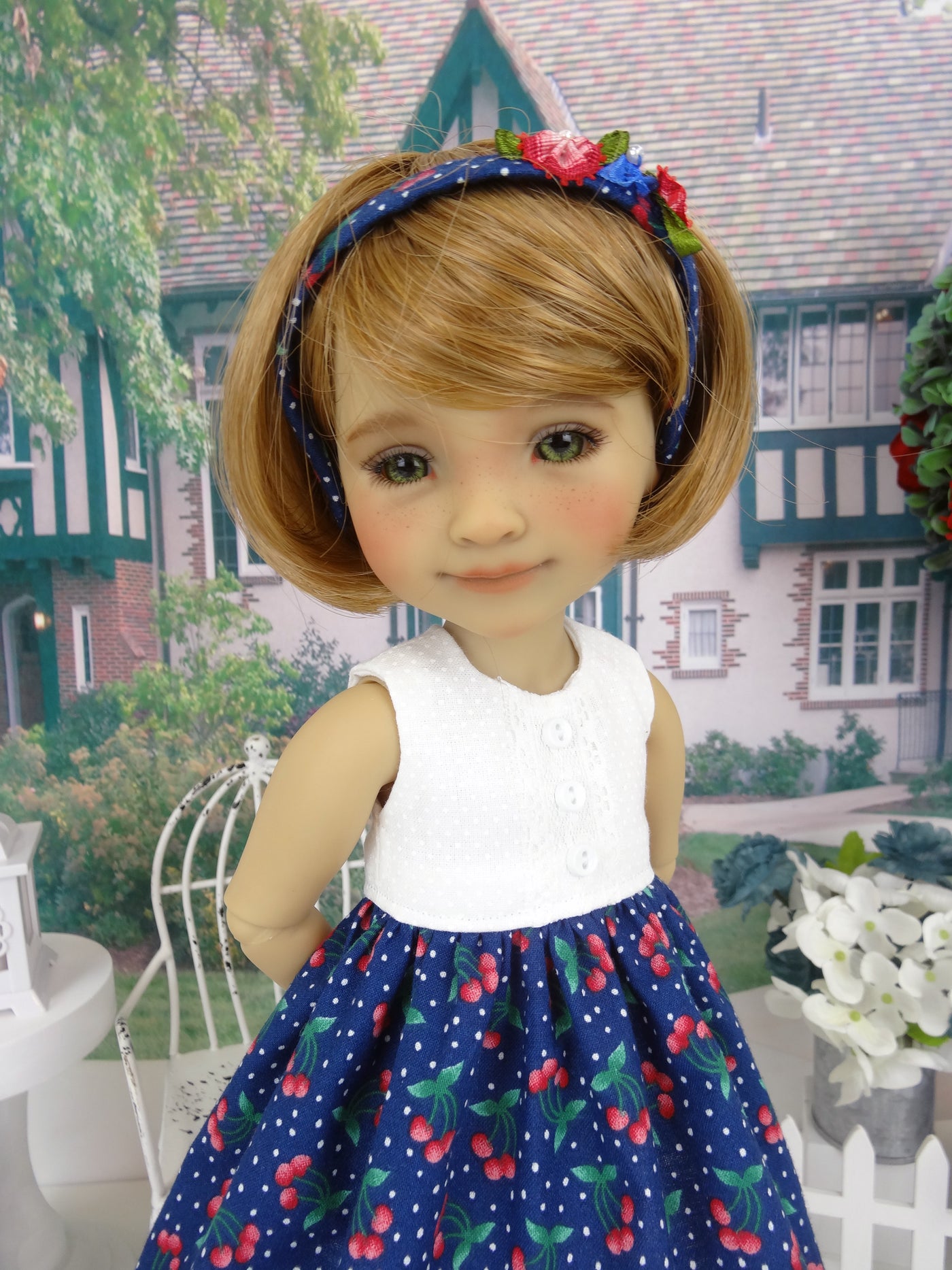 This precious babydoll style dress and sweater ensemble is the perfect addition to your Fashion Friend's wardrobe. The dress is made of a sweet ruby red cherry print on dark blue cotton. The fully lined bodice is made of contrast white polka dot print cotton. The babydoll waist bodice feature a placket of white lace with three dainty white buttons down the front. The skirt is gathered at the waist for a lovely silhouette. The dress fastens in back with buttons. Add the matching headband for a hair accessory. The wire frame headband is covered with cherry print cotton embellished with three ribbon flowers in red and blue. Wear the dress alone or pair with the coordinating sweater. The sweater is made of high quality ruby red yarn with short sleeves with a trio of ribbon flowers in red and blue adorning the lapel.