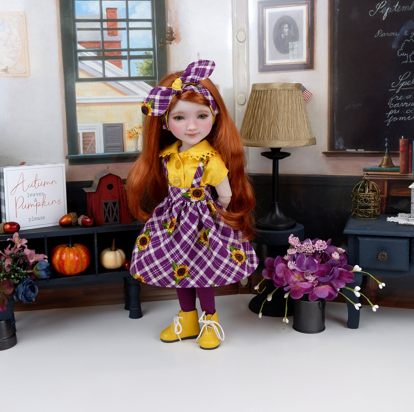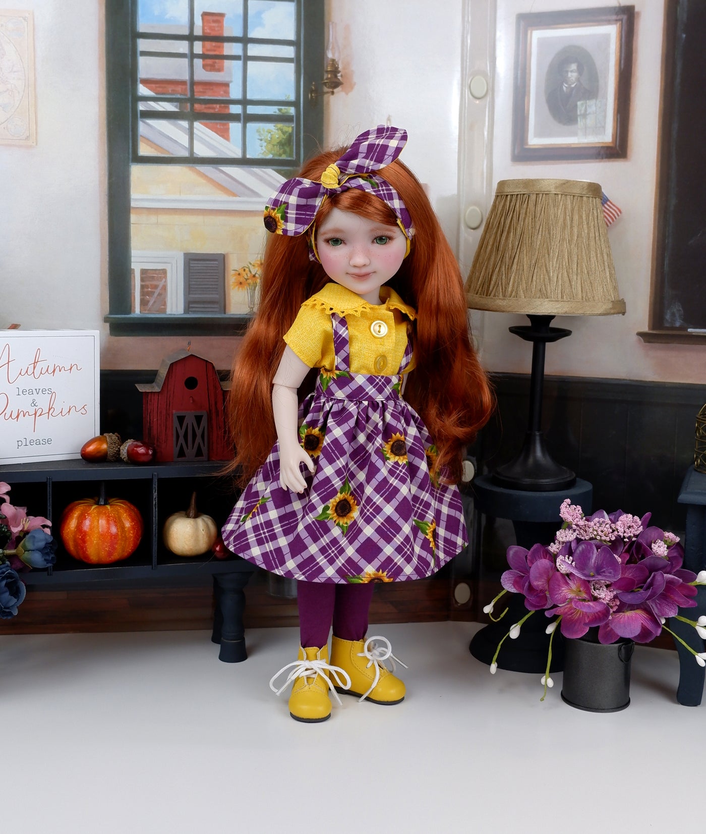 This beautiful ensemble will be a perfect addition to your Ruby Red Fashion Friend's wardrobe for this Autumn. The blouse is made of a pretty golden yellow crosshatch print cotton. The blouse features cap sleeves and a buster brown collar trimmed with marigold crochet cluny lace. The blouse fastens down the front with buttons. The adorable jumper is made of a pretty golden yellow sunflower print on mulberry plaid print cotton. The skirt features straps that attach at the waist. The skirt fastens with a button covered snap at the waist band. Add the matching headband for a hair accessory. The retro style knot headband is made of sunflower and crosshatch print cottons and features elastic behind the neck for easy styling.