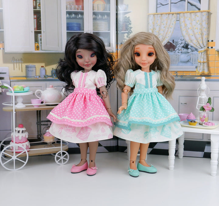 This sweet dress and apron ensemble is the perfect addition to your Ava's wardrobe. The dress is made of a darling seafoam baking print on ivory cotton. The fully lined bodice features a faux placket of iridescent ivory ribbon over seafoam crochet lace. The short sleeves are gathered with a bit of elastic above the elbow. The skirt is gathered at the waist for the perfect silhouette. The dress fastens in back with buttons. Over her dress she wears a cute half apron. The apron is made of an adorable seafoam polka dot cotton. The skirt is adorned with a row of iridescent ivory ribbon and seafoam crochet lace peeking out beneath the hem. The apron ties in back with ribbons. Coordinates perfectly with Wee Baker in Pink.