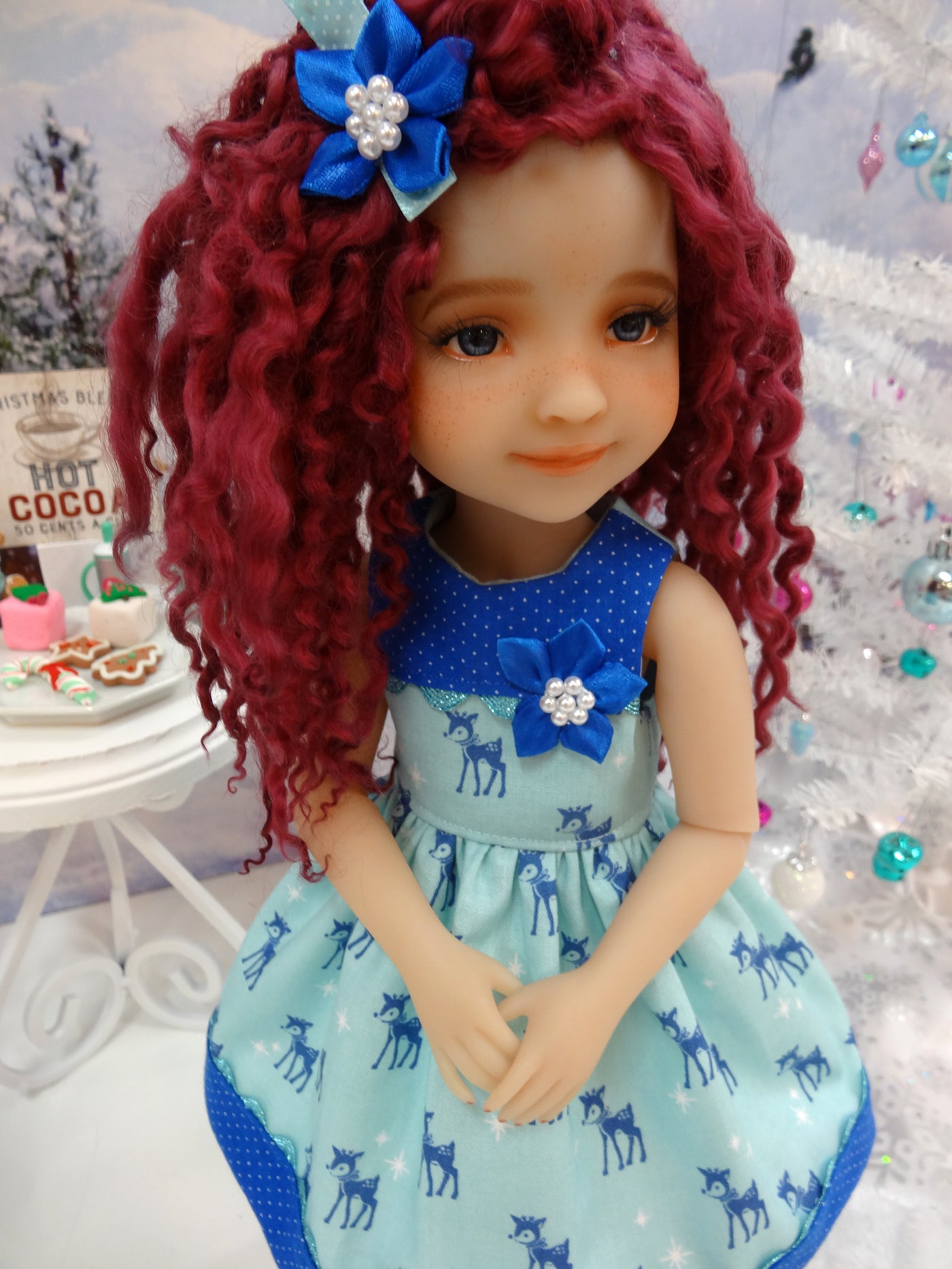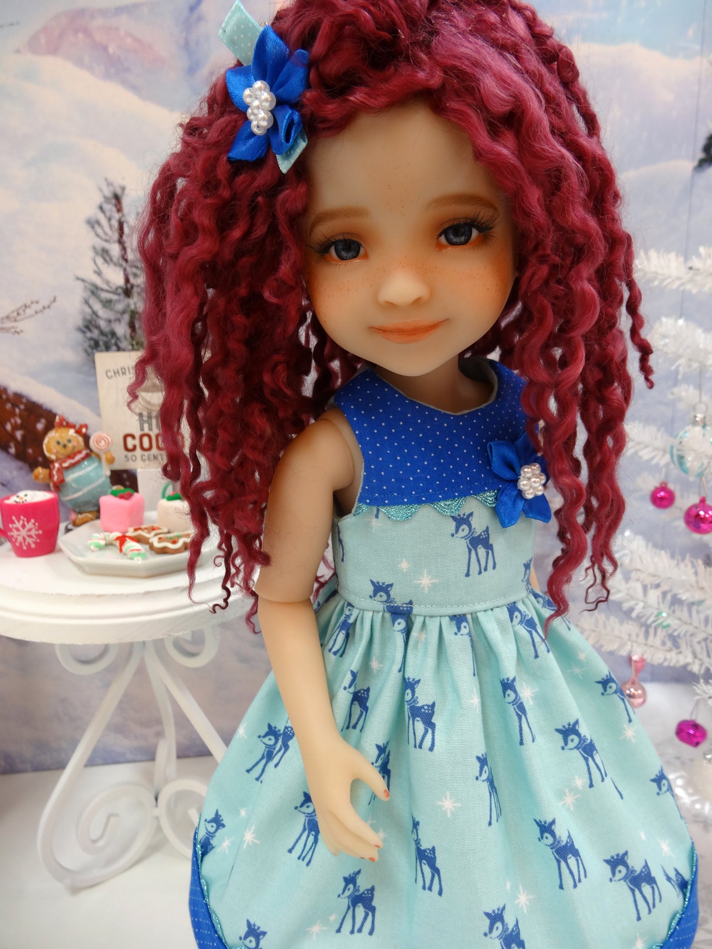 This adorable sleeveless dress is the perfect addition to your Fashion Friend's wardrobe for this holiday season. The dress is made of a sweet reindeer print in blue on aqua cotton. The bodice is fully lined and features a contrast overlay of blue polka dot cotton trimmed with metallic aqua rick rack. A blue ribbon flower adorns the bodice. The skirt is gathered at the waist for a lovely silhouette with a contrast band of blue polka dot cotton trimmed with metallic aqua rick rack above the hem. The dress fastens in back with buttons. Add the matching blue ribbon flower on ribbon hair clip for a cute hair accessory.