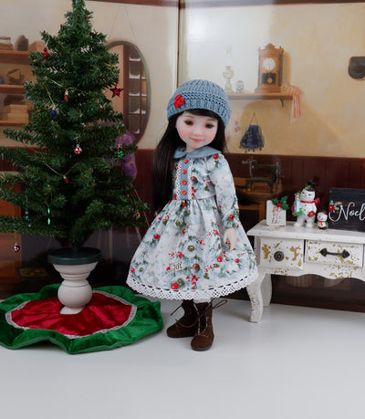 This pretty ensemble will make a great addition to your Fashion Friend's closet for this Winter. The dress is made of a lovely Christmas tree forest print in white and evergreen with red ornaments on dusty blue cotton. The bodice is fully lined with a mock placket in dusty blue square print cotton trimmed with white crochet lace down the front. Four dainty red buttons adorn the bodice. The peter pan collar is also made of dusty blue square print cotton. The full sleeves feature a bit of elastic at the wrist. The skirt is gathered at the waist for a beautiful silhouette with white crochet lace peeking out beneath the hem. The dress fastens in back with buttons. To add to the charm of her outfit, she has a knit hat. Her knitwear is made of dusty blue high quality yarn and the hat features a trio of red ribbon roses on the edge.