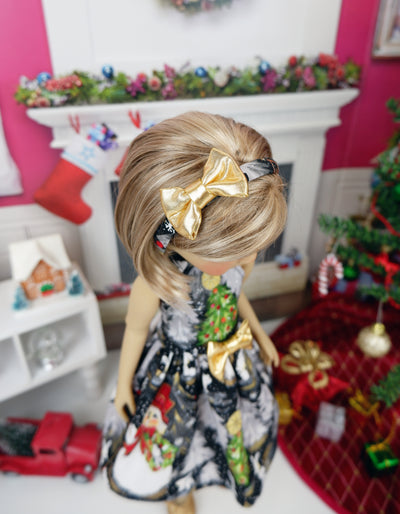 This pretty dress is a great addition to any Ruby Red Fashion Friend's wardrobe for this Winter. The dress is made of an adorable snowman and white bunny print with forest Christmas trees on black cotton with gold accents. The fully lined bodice has a high neck in front with angled straps that attach in back. The skirt is full and gathered at the waist for a wonderful silhouette. A gold fabric bow adorns the waist. The dress fastens in back with buttons with a faux double breasted look. Add the matching headband to finish the look. The wire frame headband is covered with winter print cotton embellished with a gold fabric bow.